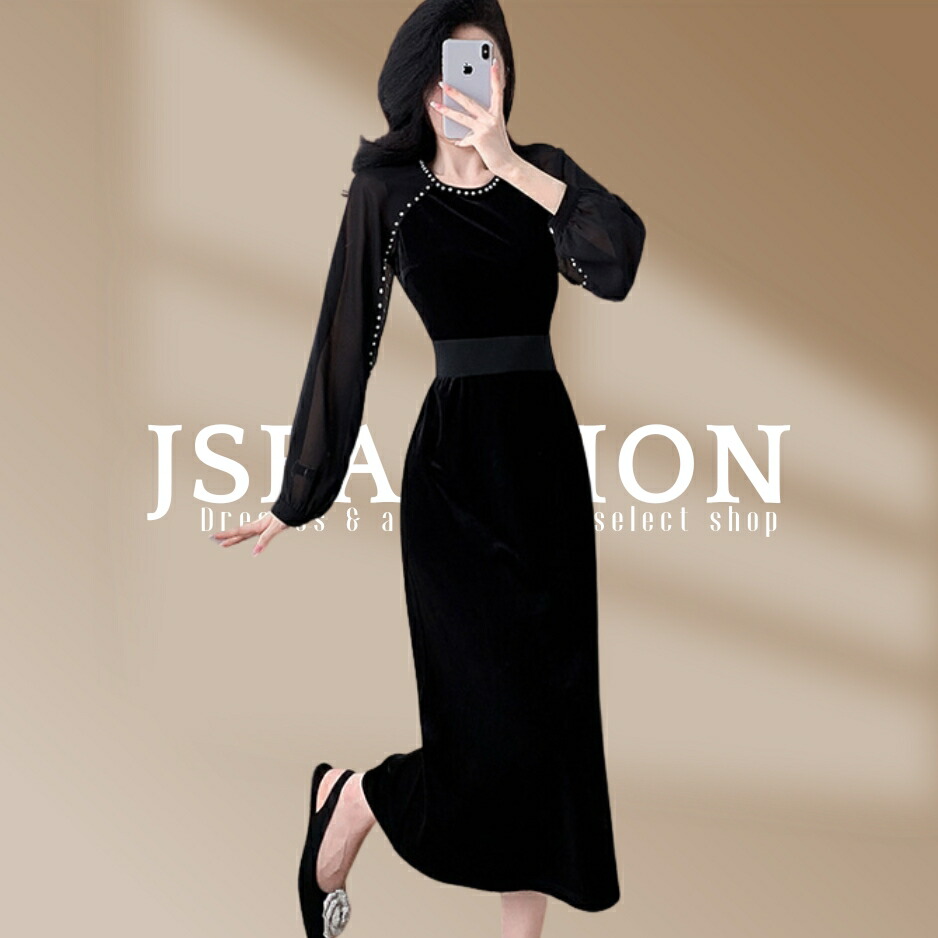 ベロア パーティードレス シア― ボリューム袖 タイト マーメイド ワンピース ビジュー付き お呼ばれドレス 長袖 ブラックドレス 黒 膝下丈 ロング丈 ミモレ丈 きれいめ 成人式 演奏会 同 二次会