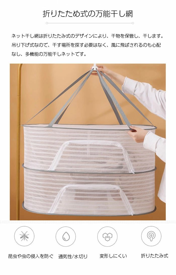 ネット干し網は折りたたみ式のデザインにより、干物を保管し、干します。 吊り下げ式なので、干す場所を探す必要はなく、風に飛ばされるのも心配 なし、多機能の万能干しネットです。