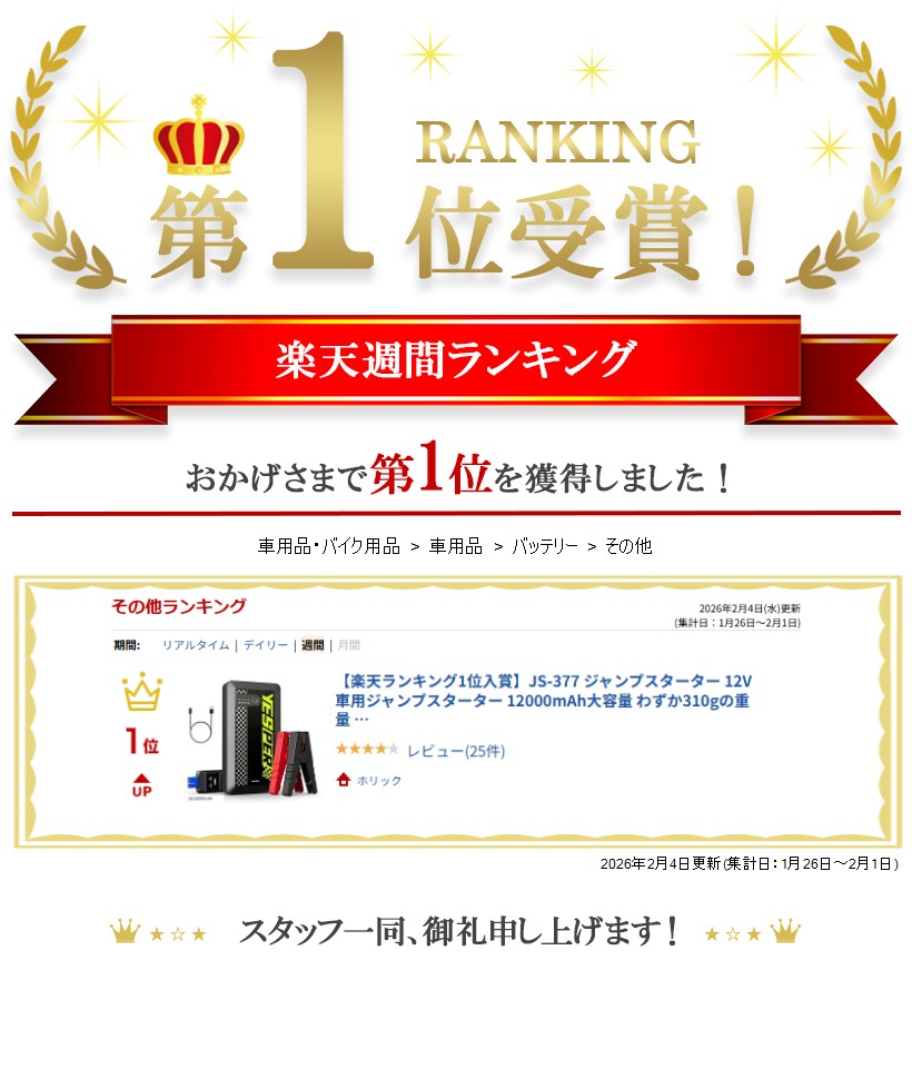 JS-377 ジャンプスターター 12V 車用ジャンプスターター 12000mAh大容量 わずか310gの重量 ピーク電流 最大6.0Lガソリン 4Lディーゼル車対応 1500A
