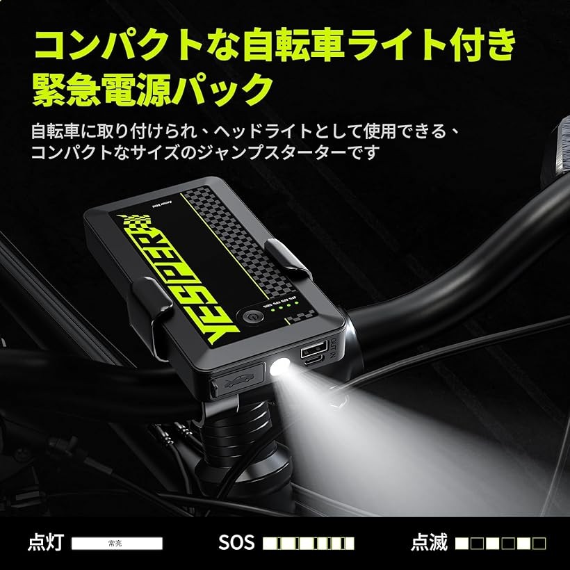 この12V バイクジャンプスターターには、点灯、SOS、点滅の3つのLEDライトモードが装備されており、自転車の前部に取り付けて、夜間の移動をより安全で便利にすることができます。