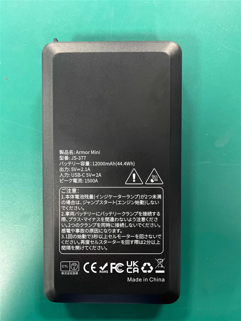 12000mAh大容量で、フル充電の状態で約30回の始動までです。
