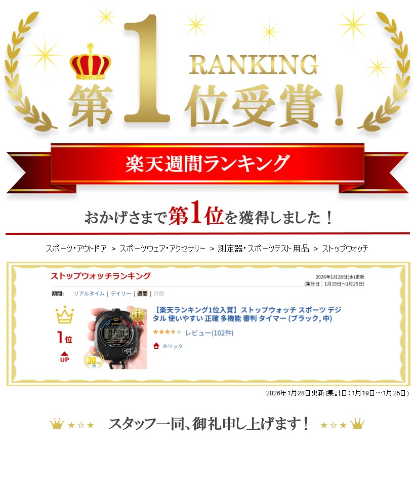 「嬉しい多機能」ストップウォッチとしてだけでなく、日付と時刻の表示やアラーム機能も搭載されており1台で幅広い使用用途が実現。高品質のABS樹脂素材で防水性や耐衝撃性にも優れ、実用性も抜群です。