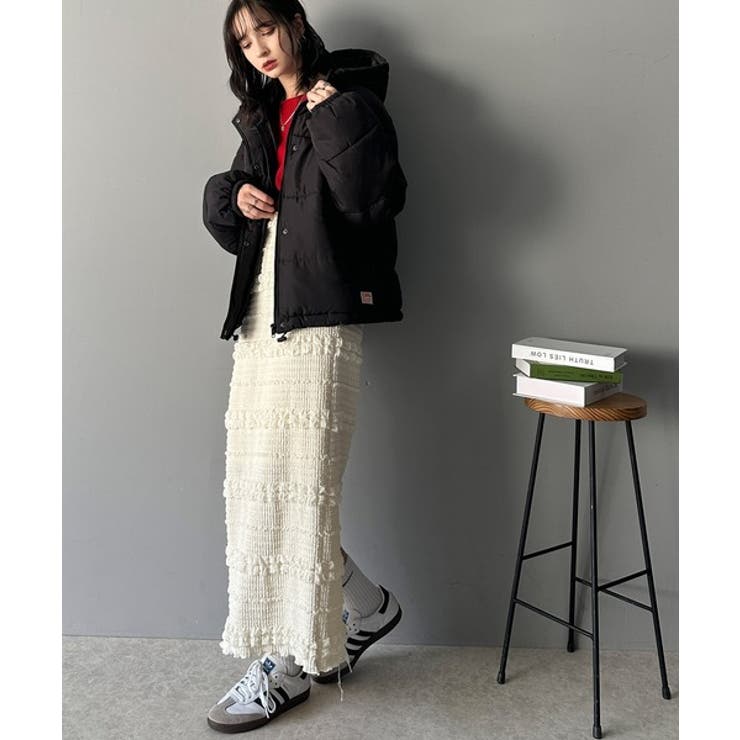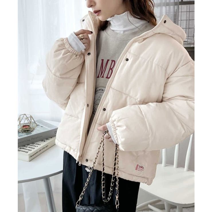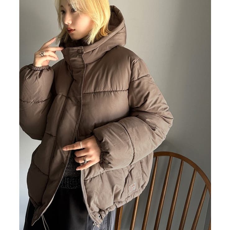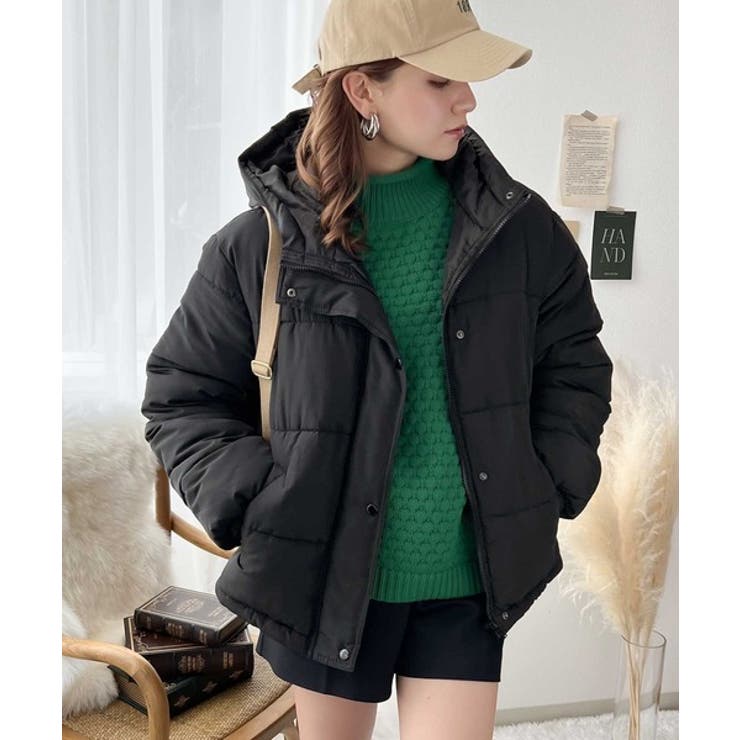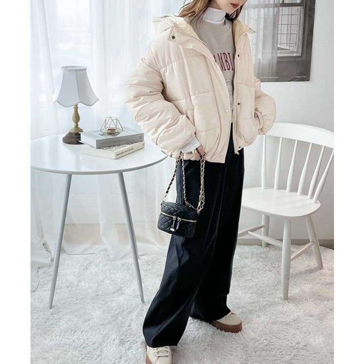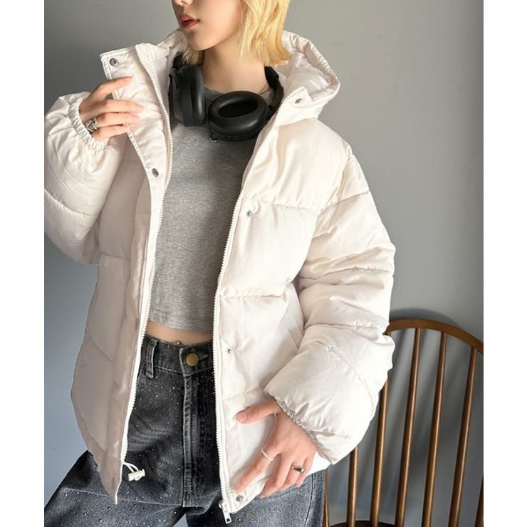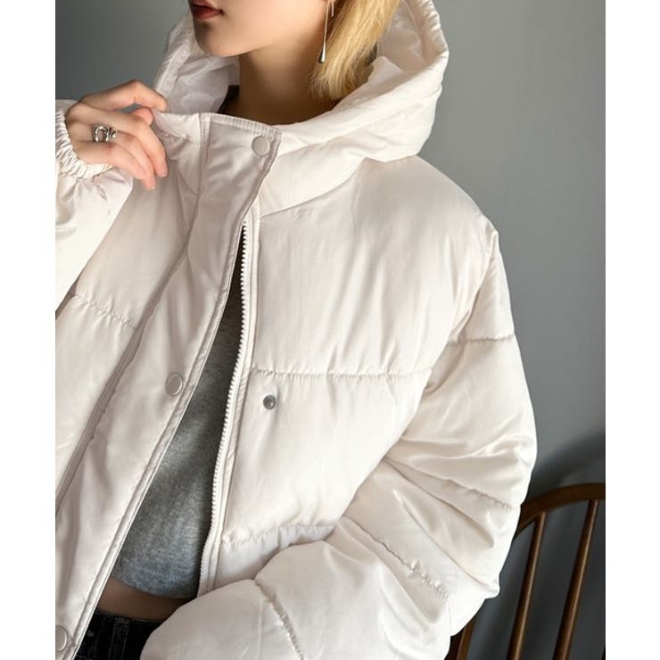 フード付きフェイクダウンコート。