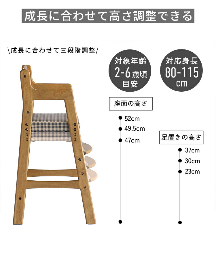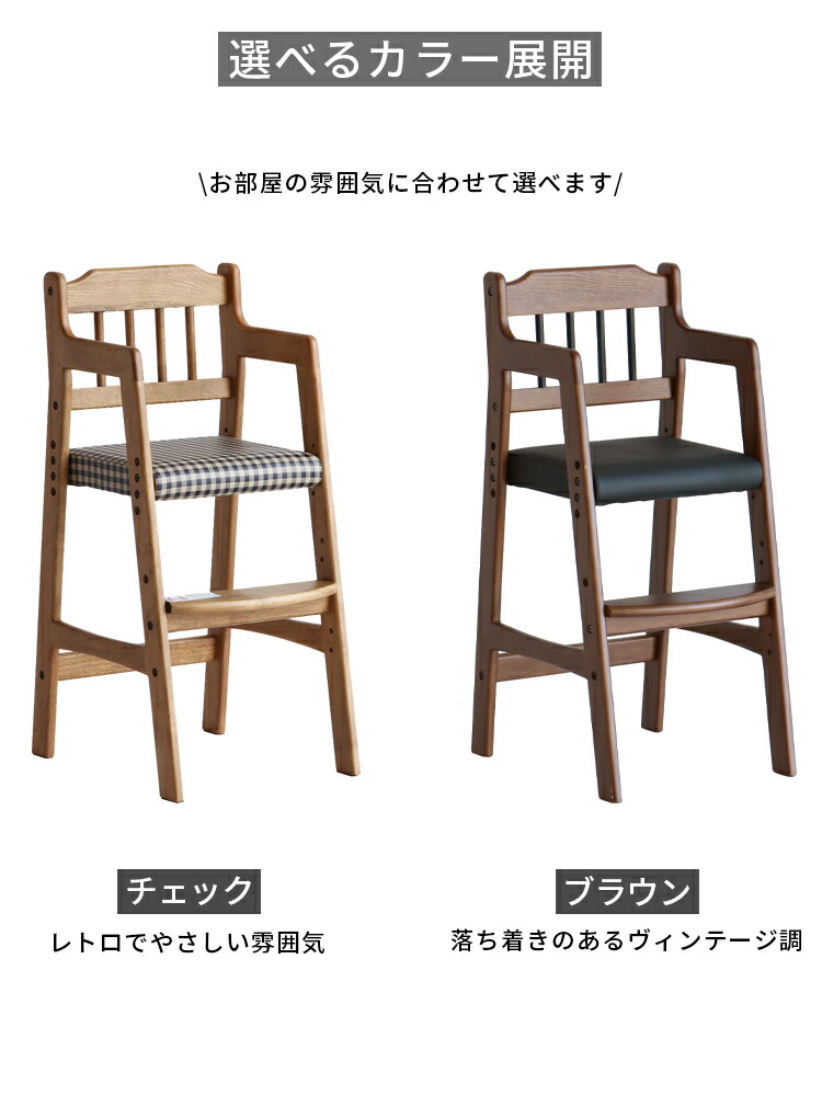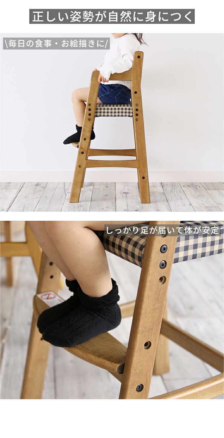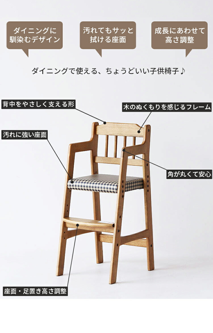 安心保証 キッズチェア 子供椅子 ハイチェア 木製 ダイニングチェア 高さ調整3段階 長く使える 天然木オーク 座面レザー&チェック柄 おしゃれ 北欧 モダン 学習椅子 リビング学習 食 ベビーチェア
