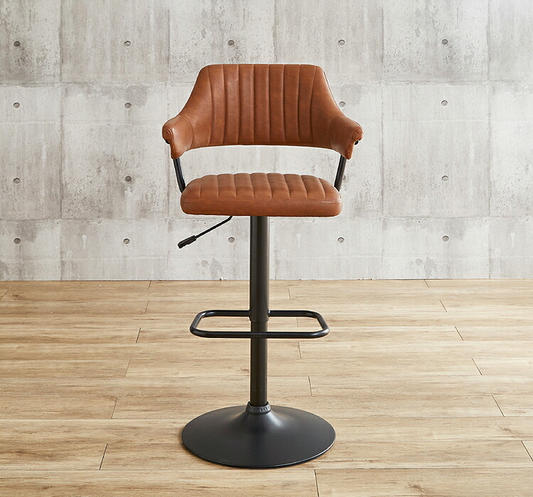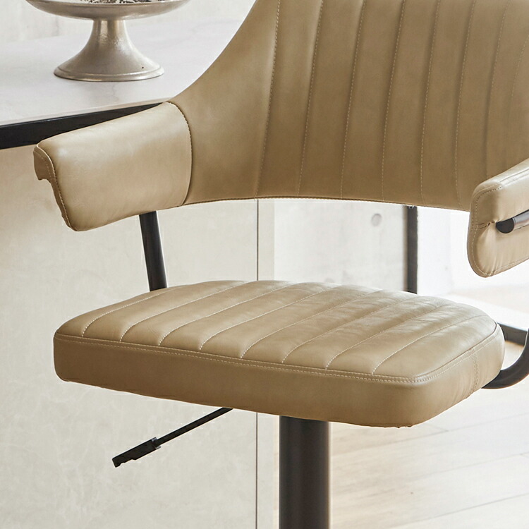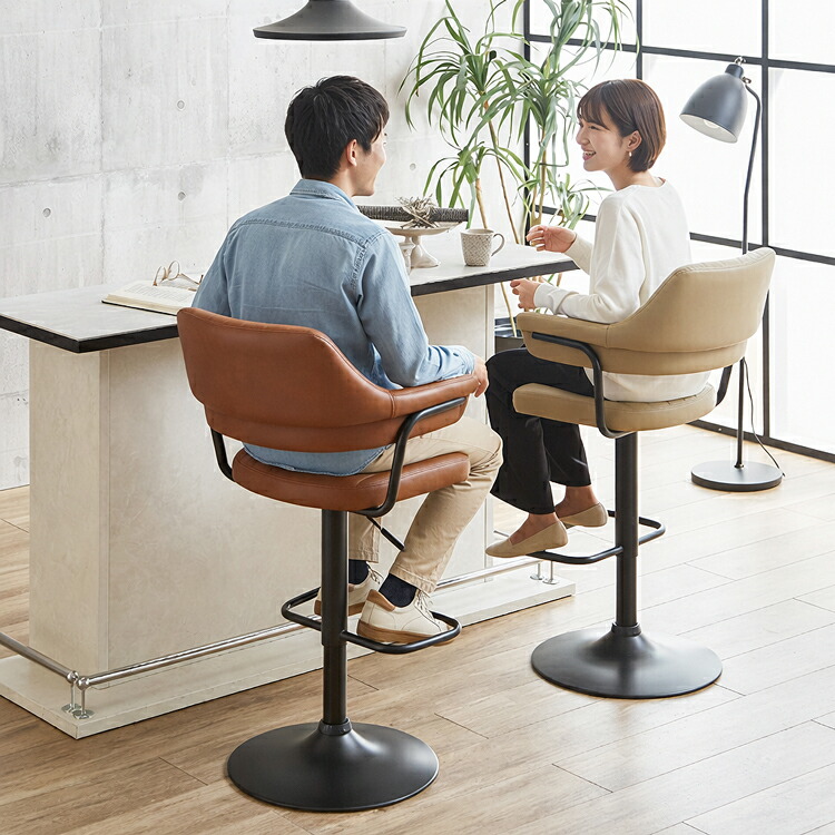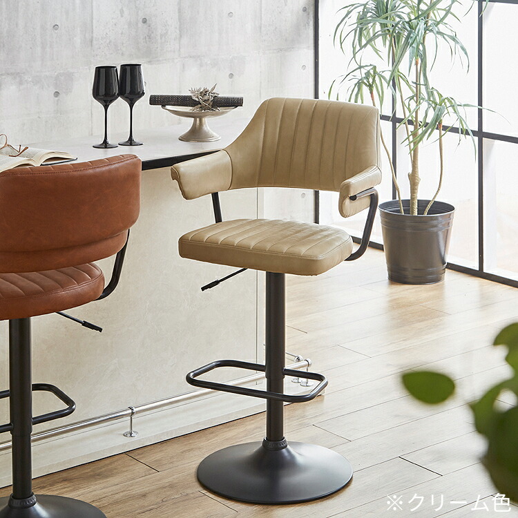 映画のワンシーンで見たような、レトロなデザインが目を引く肘付きのカウンターチェア。背もたれと肘が一体となった座面は身体のラインに合わせて緩やかにカーブ。身体を包み込むようにフィットし、快適な座り心地となっています。張地にはヴィンテージ調のPUレザー(合成皮革)を使用しており、座面・背もたれ・肘部分はウレタンフォーム入りで長時間座っても疲れにくくなっています。座面はガス圧昇降タイプで座面高57~79cmまでの調節ができ、立ち座りの動作がスムーズに行える360度回転式。脚部はデザインを引き締めるブラック色のスチール製を採用。ライトブラウン、クリームの2色よりお選び頂けます。