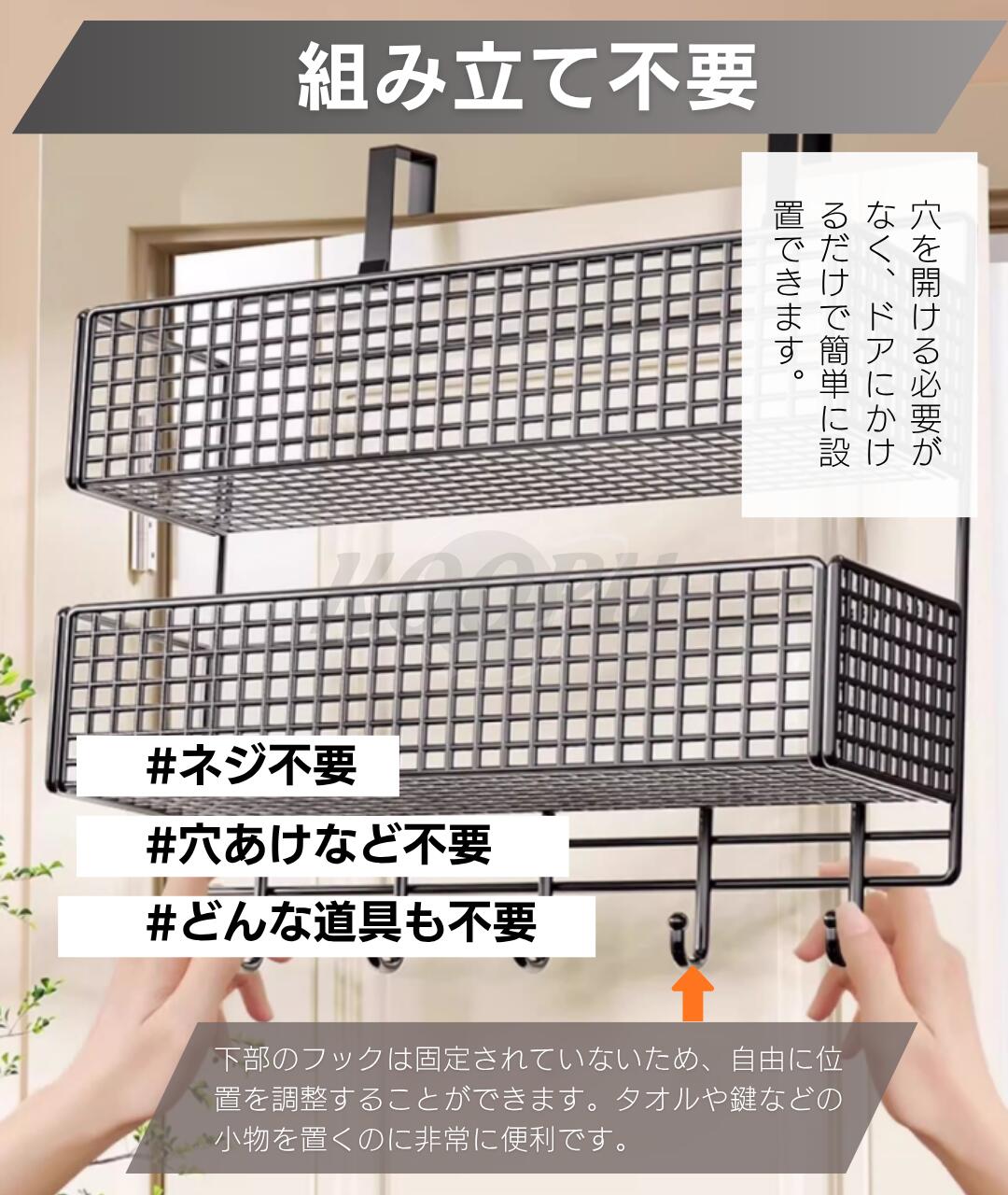 ・穴を開ける必要がなく、ドアにかけるだけで簡単に設置できます。