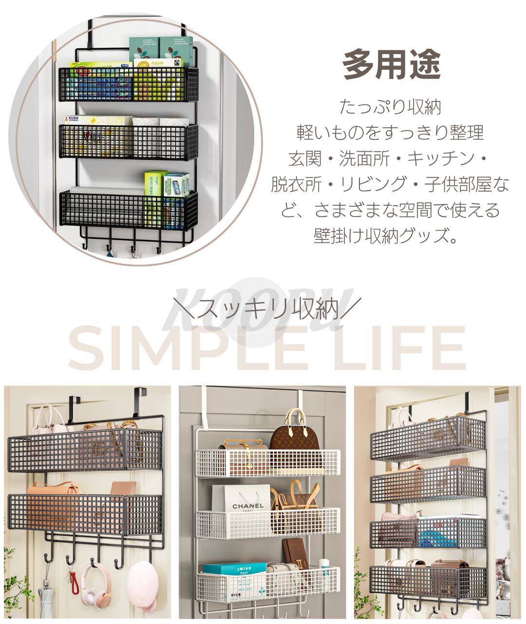 ・玄関・洗面所・キッチン・脱衣所・リビング・子供部屋など、さまざまな空間で使える壁掛け収納グッズ。