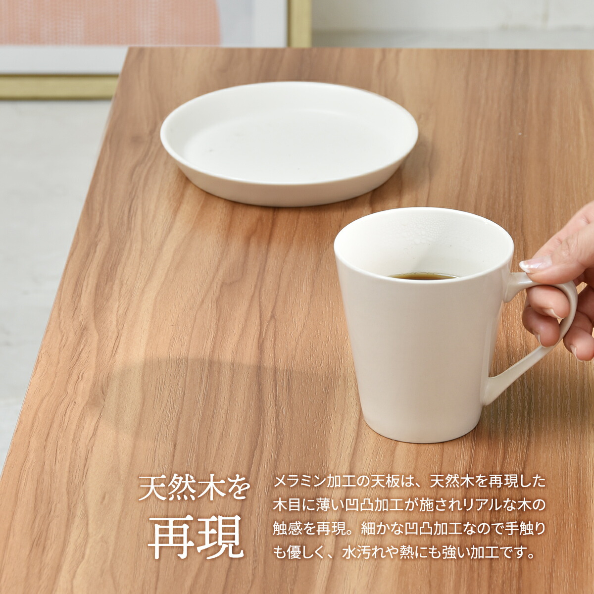 メラミン加工の天板は、天然木を再現した木目に薄い凹凸加工が施されリアルな木の触感を再現。