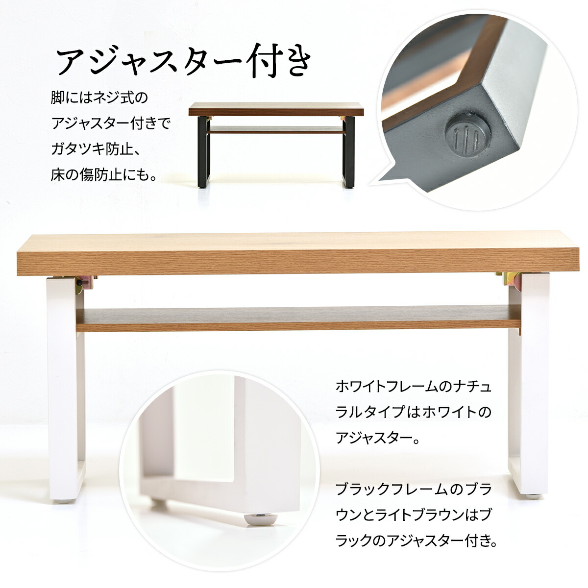 脚にはネジ式のアジャスター付きでガタツキ防止、床の傷も防止します。