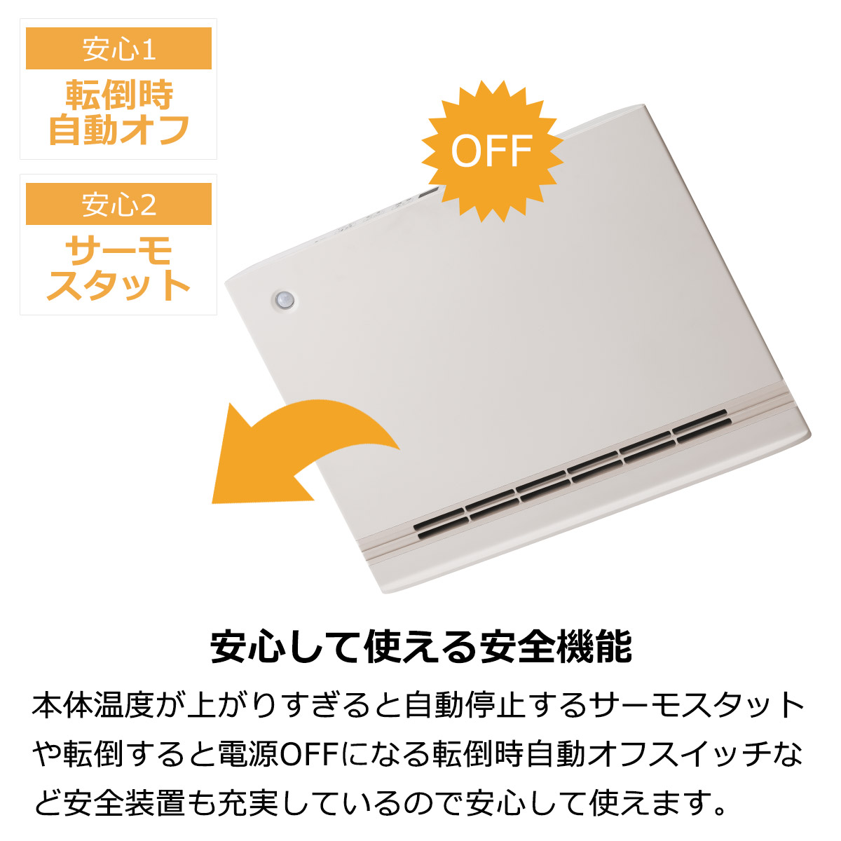 本体温度が上がりすぎると自動停止するサーモスタットや転倒すると電源OFFになる転倒時自動オフスイッチなど安全装置も充実しているので安心して使えます。