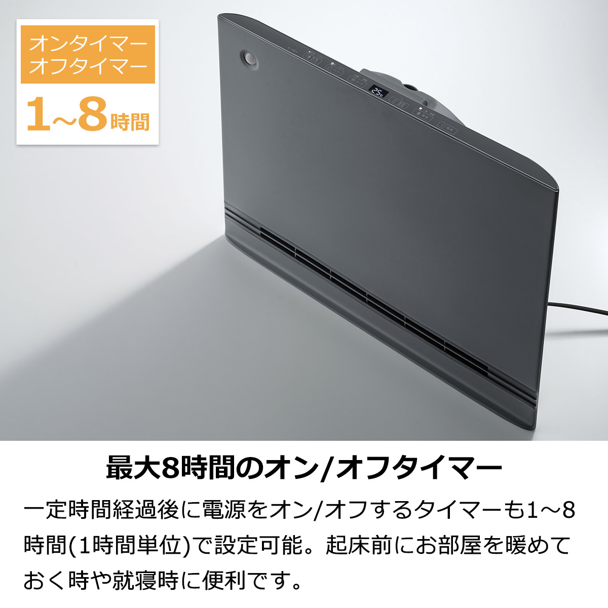一定時間経過後に電源をオン/オフするタイマーも1~8時間(1時間単位)で設定可能。起床前にお部屋を暖めておく時や就寝時に便利です。