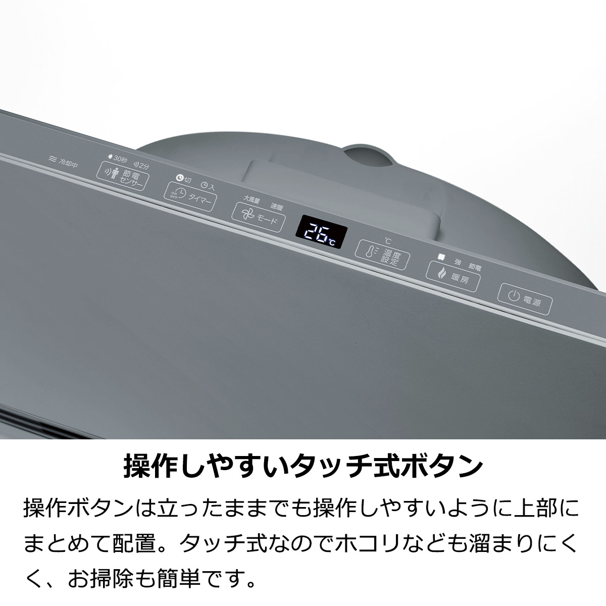 操作ボタンは立ったままでも操作しやすいように上部にまとめて配置。タッチ式なのでホコリなども溜まりにくく、お掃除も簡単です。