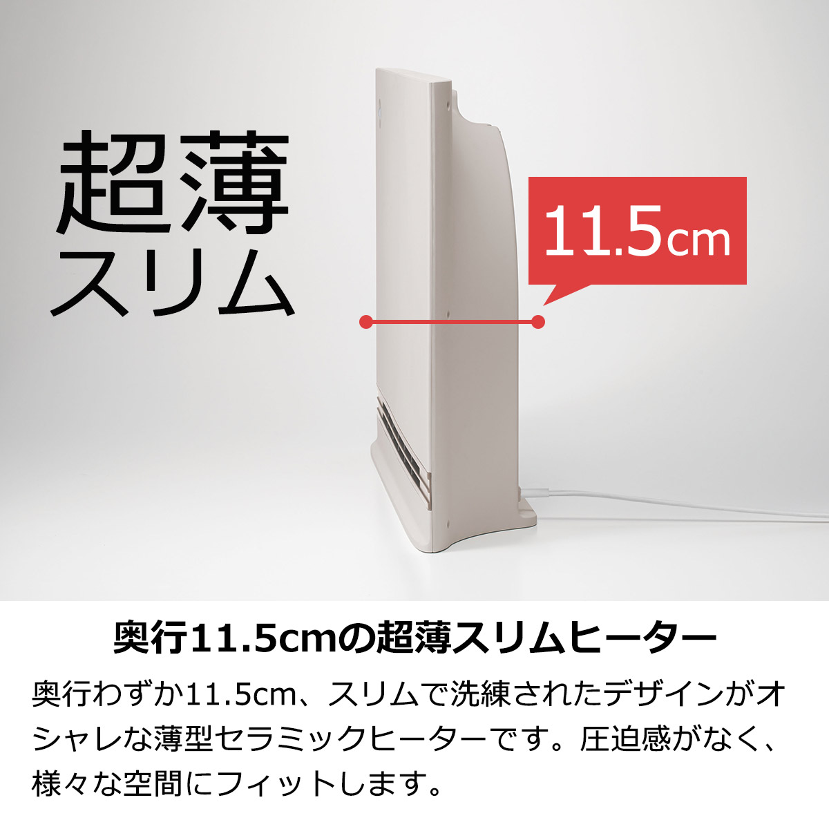 奥行わずか11.5cm、スリムで洗練されたデザインがオシャレな超薄型セラミックヒーターです。圧迫感がなく、様々な空間にフィットします。ワイドな吹出口からのパワフルな温風でお部屋を暖めます。節電センサーと室温センサーを使った自動運転やオン/オフタイマーなど便利な機能を搭載。便利な薄型リモコンも付属。