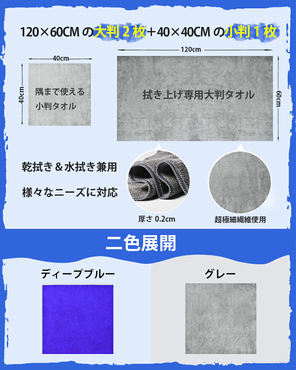 洗車 タオル 大判 マイクロファイバー グレー ブルー