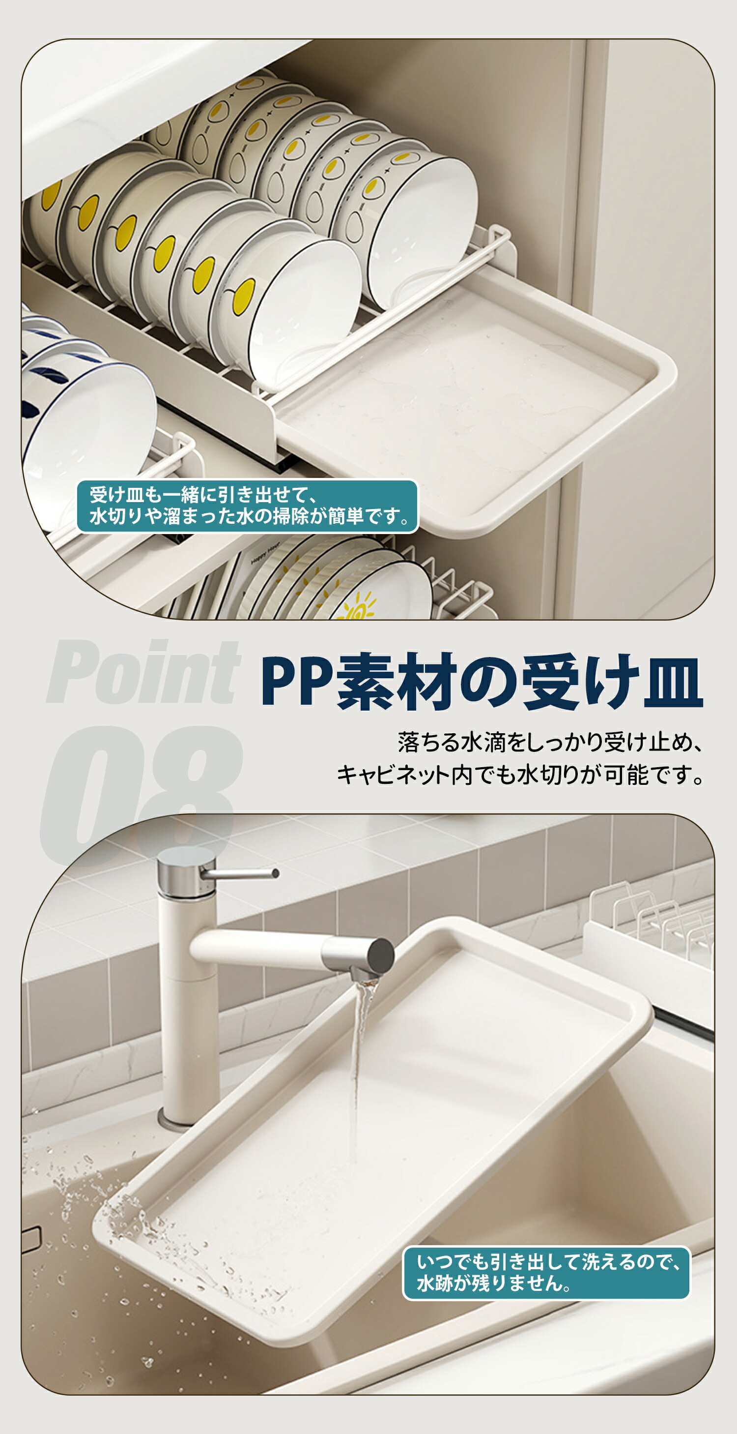底に水受けトレーが付いているので、洗ったばかりの食器はそのまま入れて水切りでき、受け皿も自由に取り外せるので衛生面も安心。