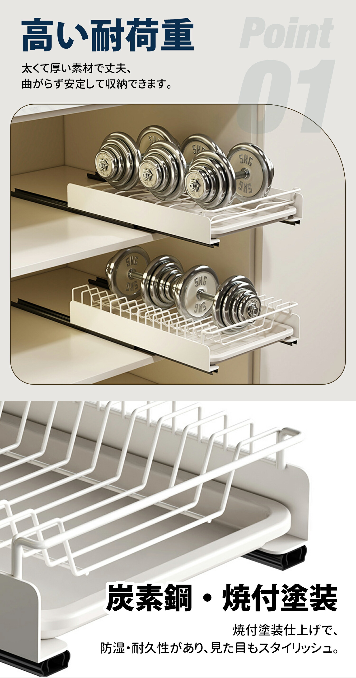 引き出しタイプで奥の物も簡単に取り出せ、シンク下などの奥が広い収納場所の活用におすすめです。