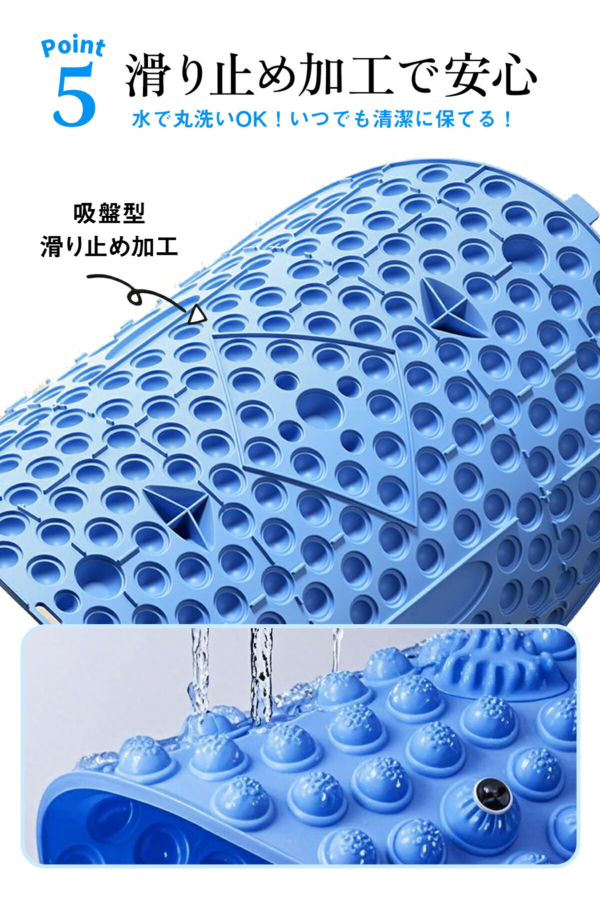 マッサージマットの裏に滑り止め素材を採用し、床を傷つけにくく使用中の安定性が保たれます。さらに、水洗いが可能でお手入れも簡単。1枚であれば家族みんなで使えます。