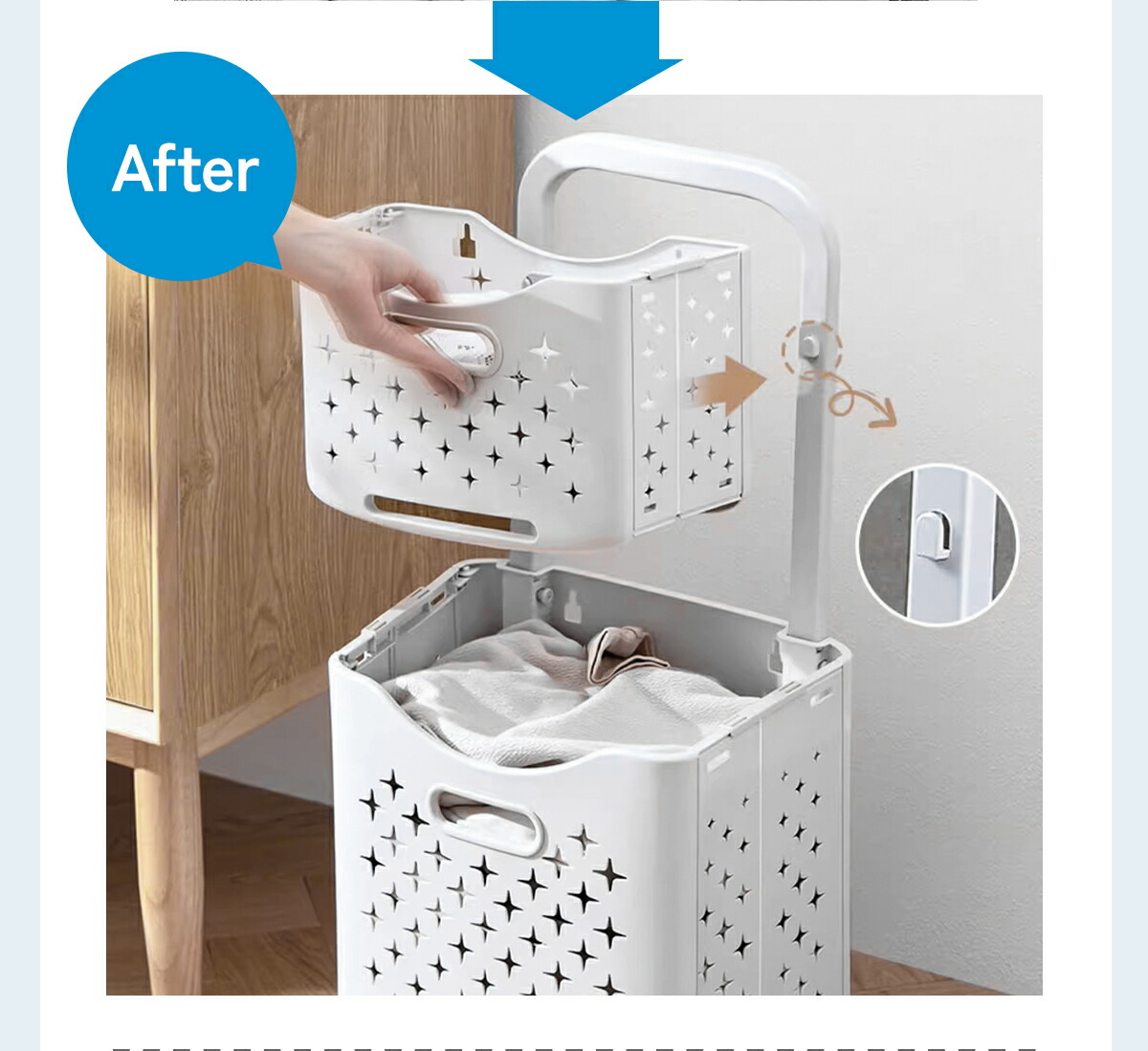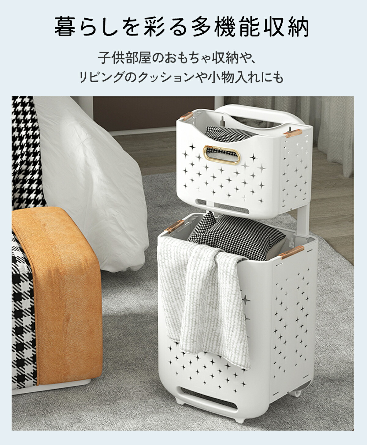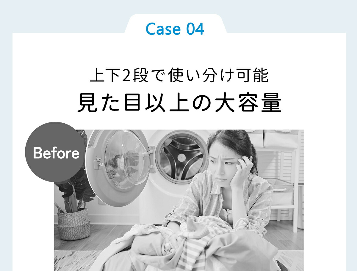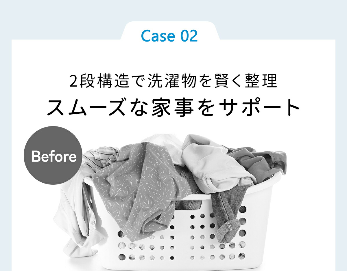 洗濯物を分別することができる2段式大容量のバスケットです。2つのバスケットが縦に配置されているため省スペースし、洗濯機に入る前に衣類の種類や色、汚れ具合など分別して収めることで、洗濯作業がスムーズになります!