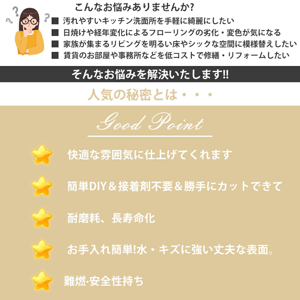 お部屋の形に合わせて、カッター1本で加工できるのでDIY初心者でも安心!簡単に施工できます。貼り付けには専門的な道具は必要ありません。台紙をはがして貼るだけ。ハサミやカッターなどで、好きなサイズにカットしてお使い頂けます。誰でも簡単にDIYできるフロアタイルシートです。