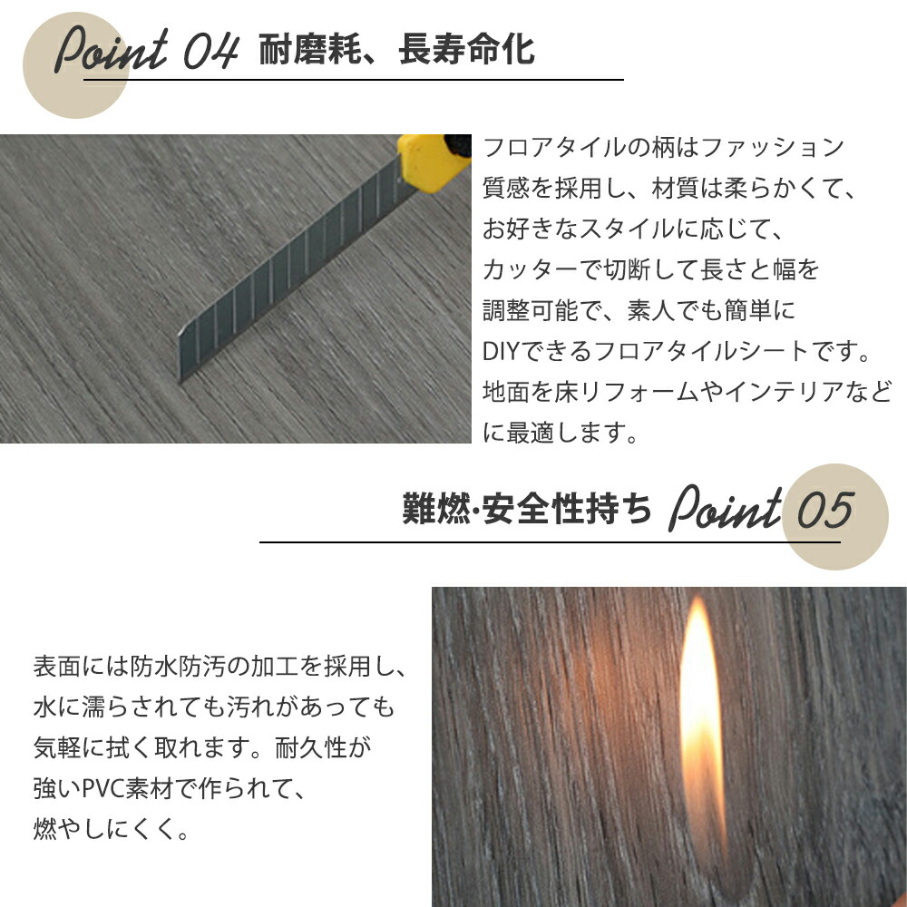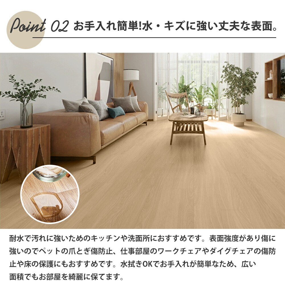 表面PVC材ならではの耐久性にこだわった多機能なフロアタイルです。厚手で丈夫な表面なのでテーブルやいすなどを移動する時にも、抜群の耐摩耗性を持つ、土足での使用でもでも長期の耐久性あります。さまざまな傷や摩耗から表面を守り美しい色柄を長期に渡って保護します。