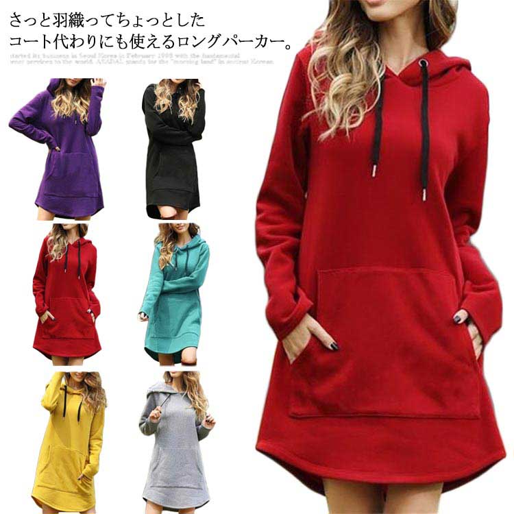 パーカー レディース ロング丈 長袖 トップス パーカー 新作 イエロー レッド パープル グレー ブラック グリーン S M L XL 2XL 3XL