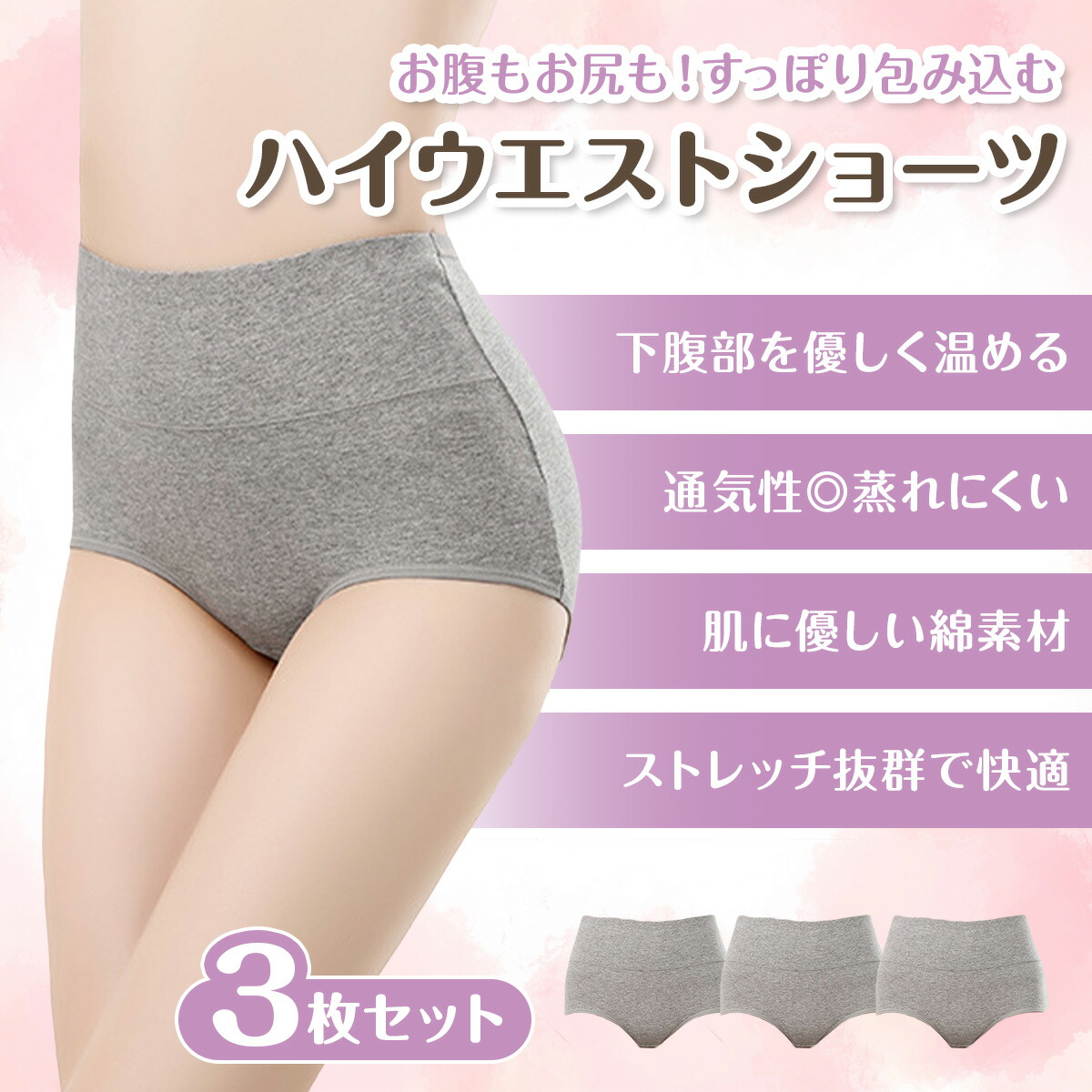 ハイウエスト ショーツ 3枚セット ガ レディース インナー 下着 ショーツ スタンダード 人気 ベージュ グレー ピンク ラベンダー ブラック M L XL XXL