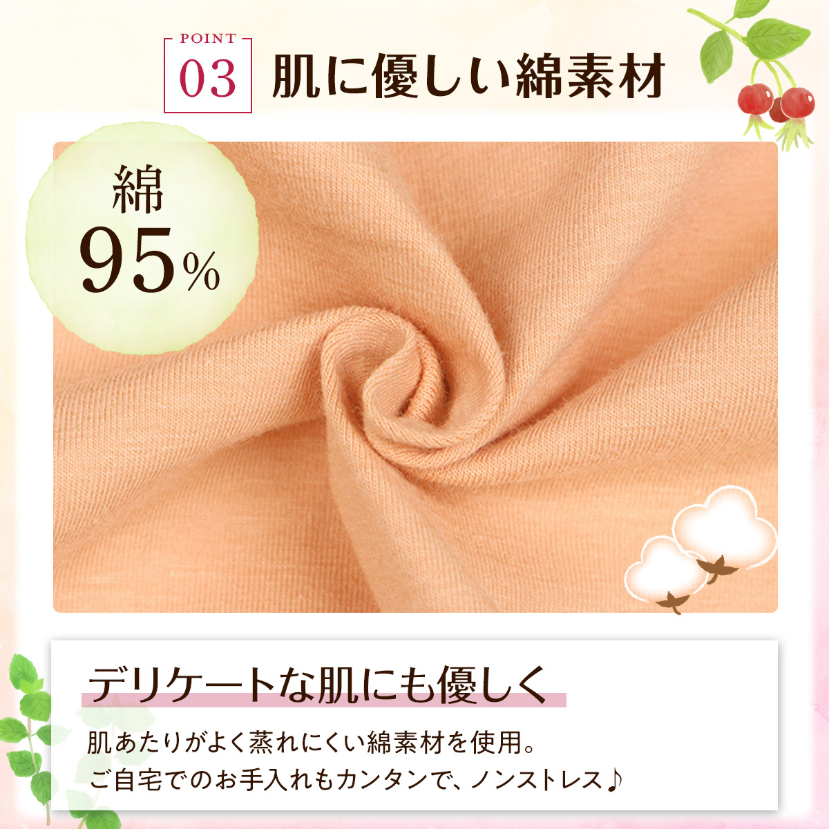 綿100%の素材を使用しており、肌触りがとても柔らかく、通気性も抜群です。長時間着用してもムレにくく、快適さを保ちます。