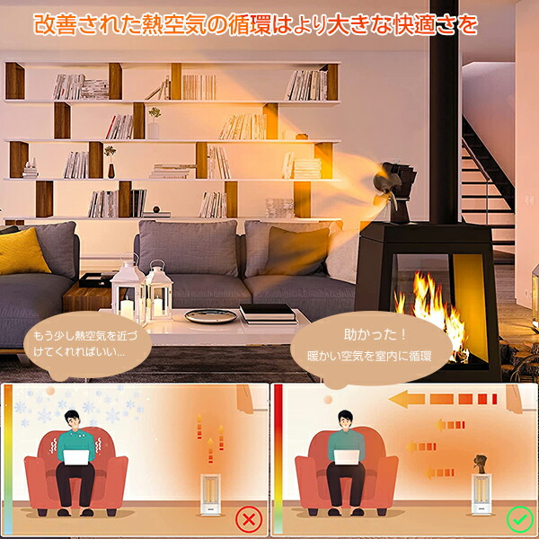 ストーブファンは、大風量のファンブレードを備えているため、温風の循環を改善し、暖かい空気が部屋全体を素早く暖めます。