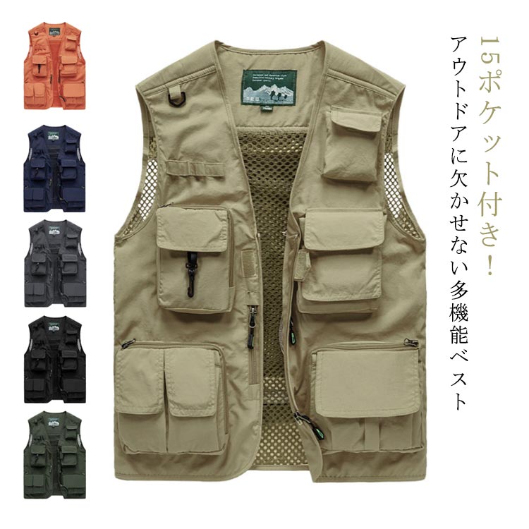 ハイキング ポケット付き ベスト 釣り トップス ベスト ジレ 早い者勝ち!ポイントUP カーキー アーミーグリーン ブラック グレー ネイビー オレンジ S M L XL 2XL 3XL 4XL 5XL
