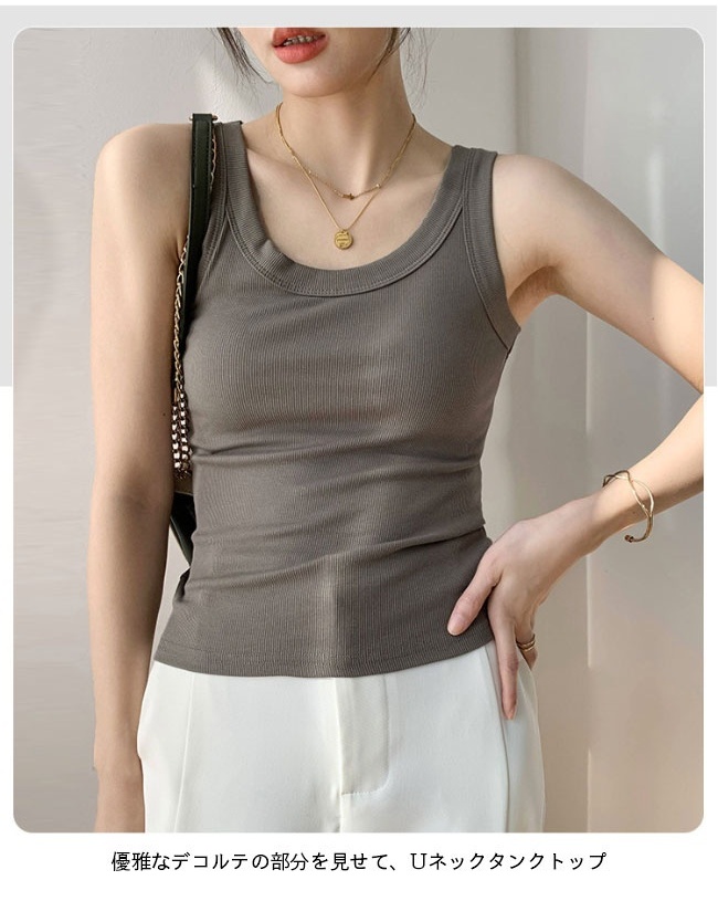 デコルテ見せ Uネック ハイストレッチ性タンクトップ レディース リブトップス