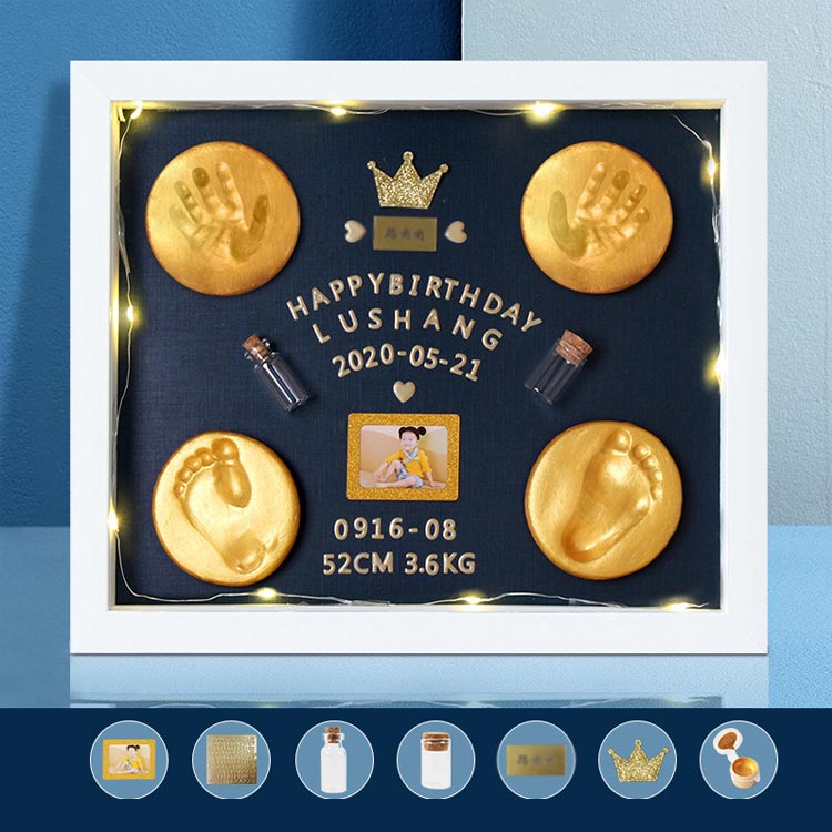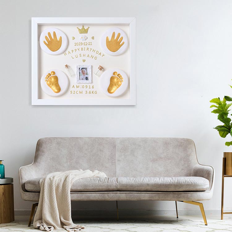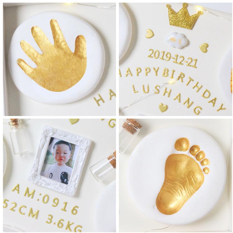 赤ちゃんの立体感のある手形を簡単に残すことができる樹脂粘土付き、生まれたときのサイズ感を振り返りながら、赤ちゃんの成長記録をかわいく飾ることができます。