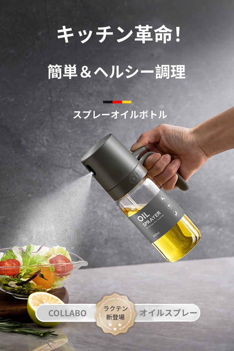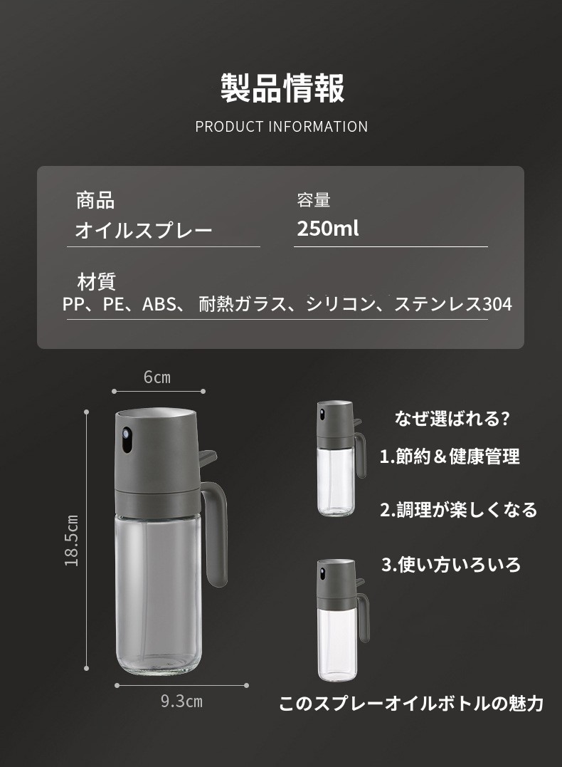 入賞 オイルスプレー オイルポット ボトル キッチン 耐熱ガラス 120°オリーブオイル 霧吹き 料理用 250ml ガラスボトル透明 スプレーボトル 調味料入れ 漏れ防止噴霧器 油さし醤油ス ミスト
