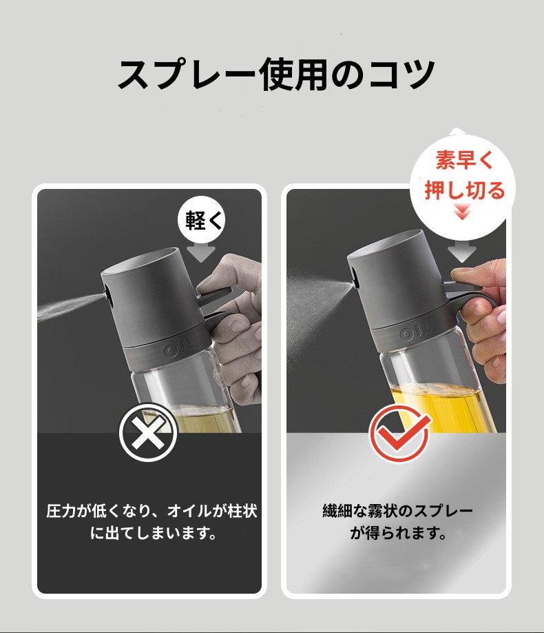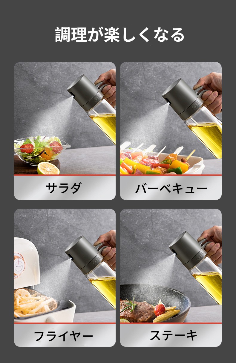 【さまざまな調味料が使える】 食用油だけでなく、ごま油、醤油、酢、酒、オリーブオイルなど、さまざまな液体調味料を入れることができます。 スプレーポートを詰まらせる可能性があるため、濃いソースを保持することはお勧めできません。 毎日のサラダ、家庭料理、バーベキュー、ベーキングなどに使用できます。