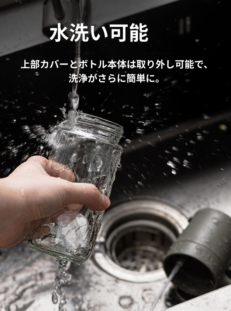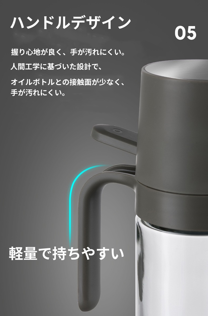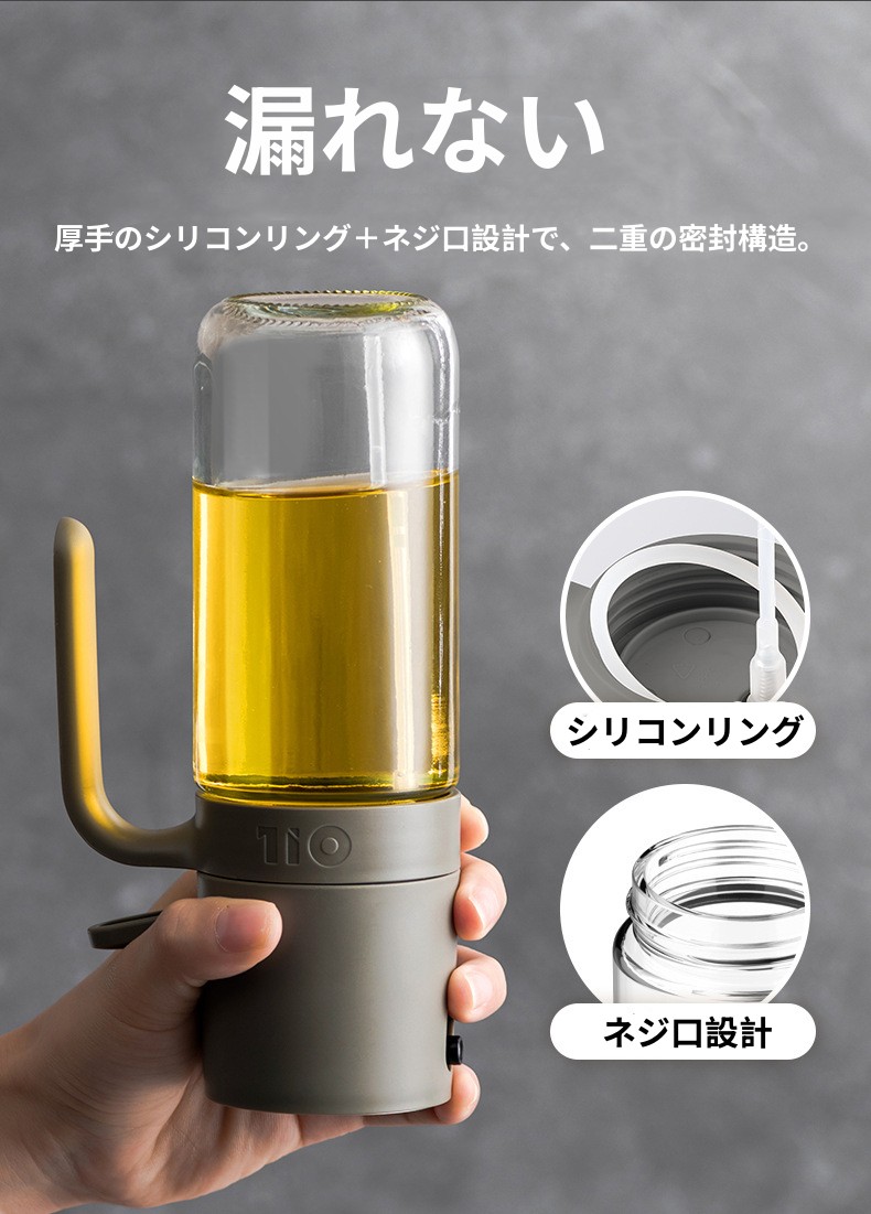 【耐熱ガラスボトル】耐熱性と耐衝撃性に優れたガラス製のボトル。従来のステンレス製に比べ、透明なガラス製で、オイルの残量を視覚的に確認することができます。調理器具のそばでも安心して使用できます。