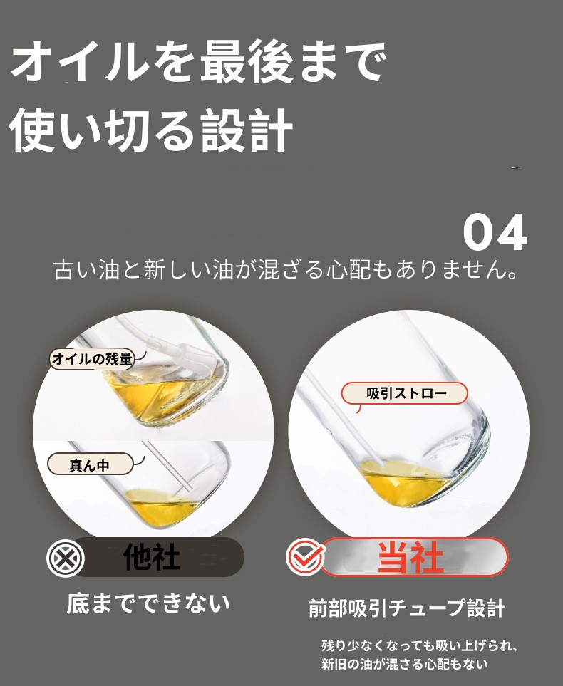 【オイルを最後まで使い切る設計】容量250ml、重さ270gで持ち運びに便利で、ガラス素材なのでお手入れも簡単です。吸引ストローがボトルの端にあるため、オイルを最後まで使い切ることができます。また、古い油と新しい油が混ざる心配もありません。