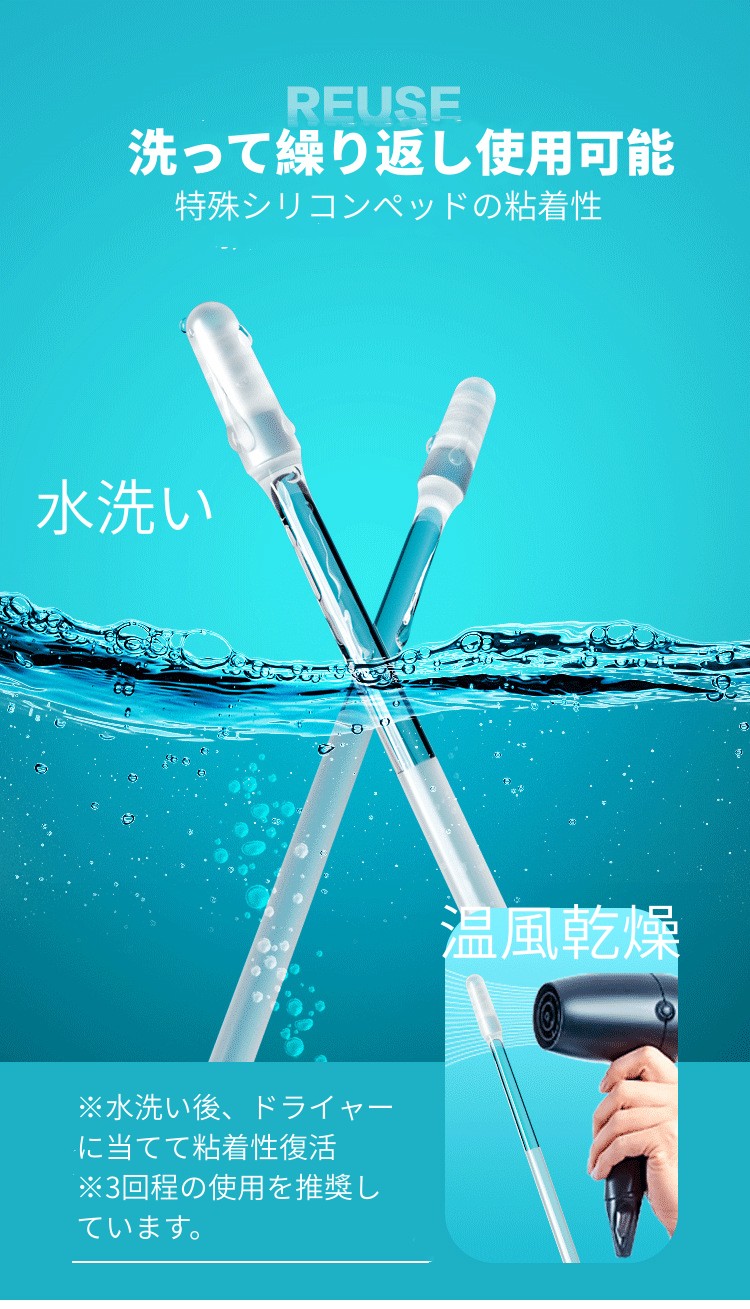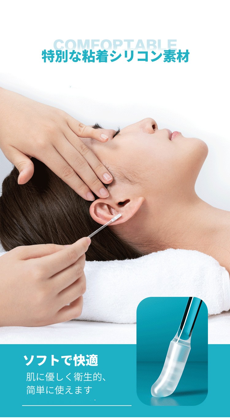 【特別な粘着シリコン素材】耳かきの先端に使用された粘着性のあるシリコン素材が、耳垢にしっかりと絡みつき、耳の奥まで徹底的に掃除します。