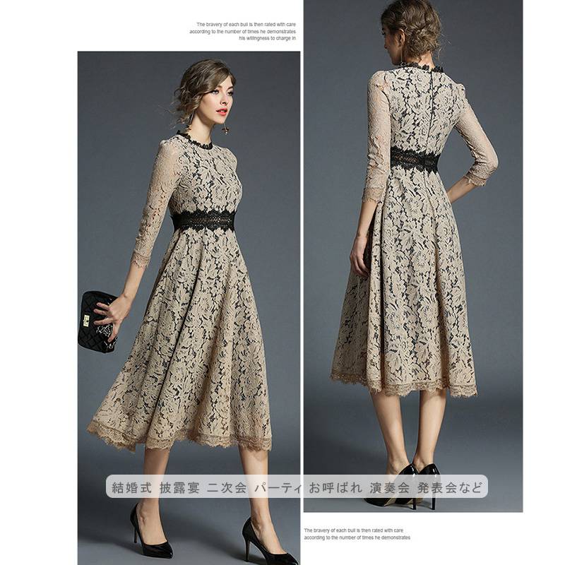パーティードレス ミモレ丈 総レース 袖あり七分袖 結婚式 ワンピース ロング ベージュブルー 大きいサイズ入園式 二次会 謝恩会 同窓会 服装 発表会 フォーマル 20代 3 大人