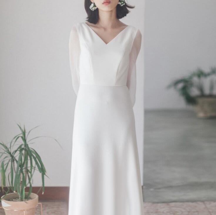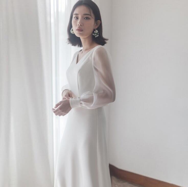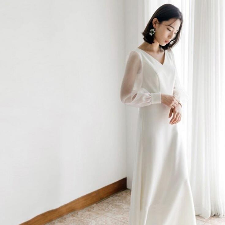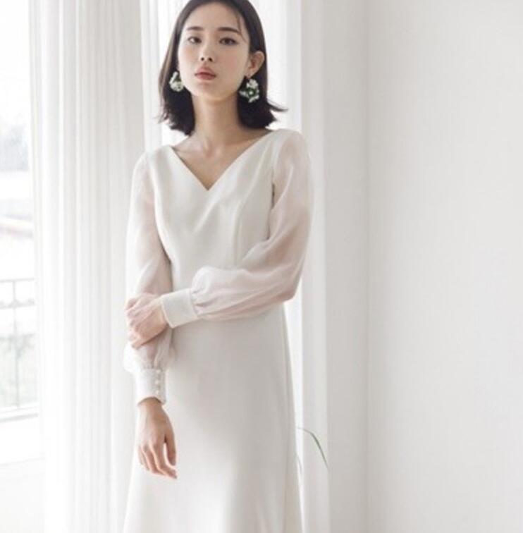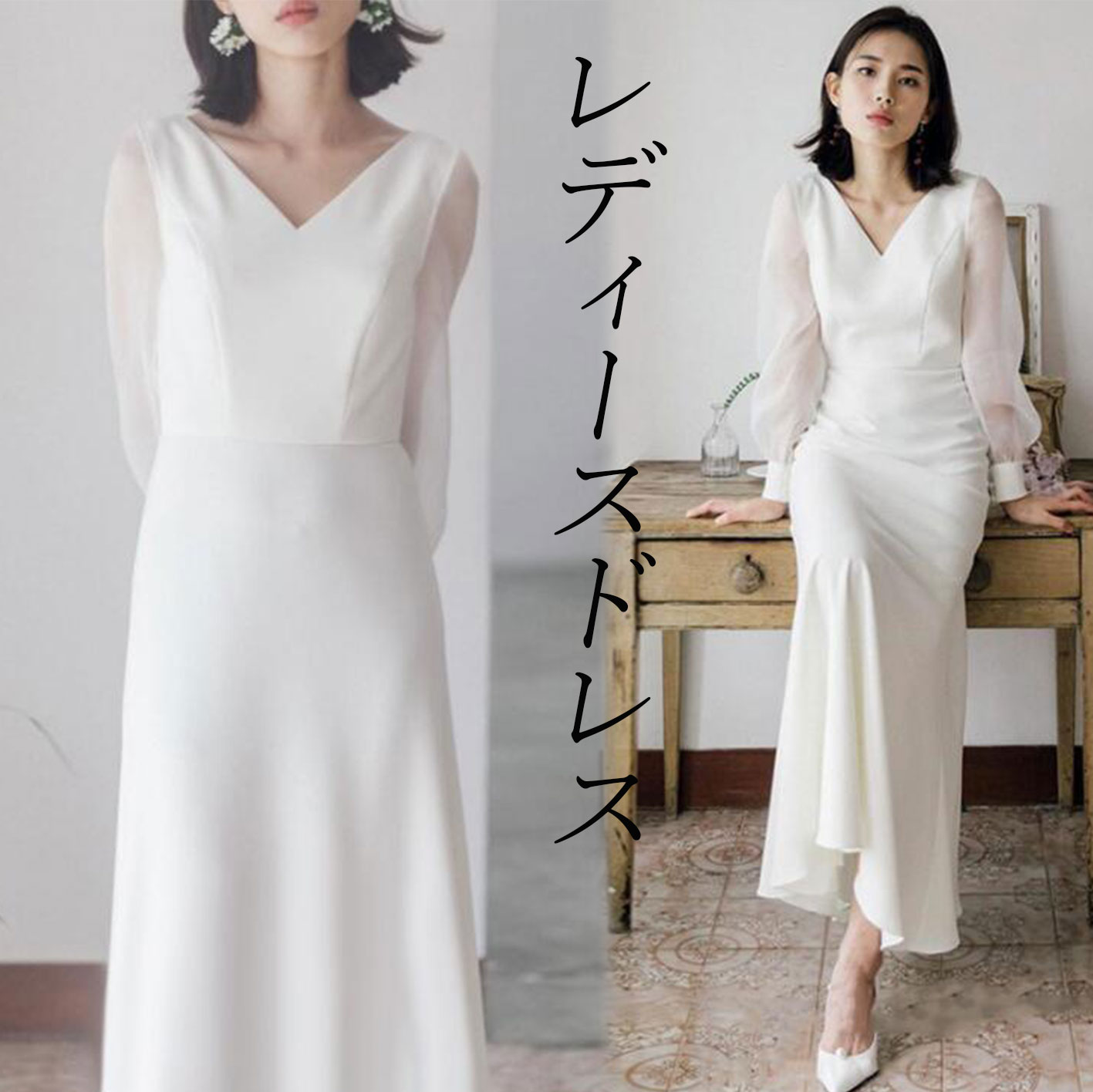 フォーマルドレス ミニドレス 長袖 Vネック 二次会ドレス ウェディングドレス 花嫁ドレス シンプル パーティードレス ロングドレス スレンダーライン 優雅 エレガント ブライダル 演奏会 音楽会 海外挙式 二次会 披露宴 後撮り 前撮り お呼ばれ 結婚式 ホワイト
