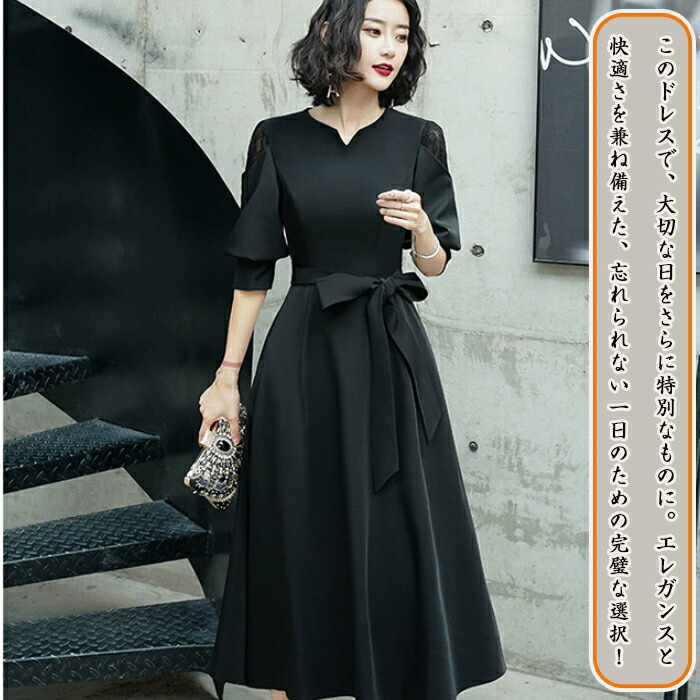 ドレス 大人 ピアノ 発表会 演奏会 ロングドレス 黒 袖あり パーティードレス 着痩せ ワンピース 中学生 高校生 イブニングドレス花柄 レディース 五分袖 Aライン 韓国