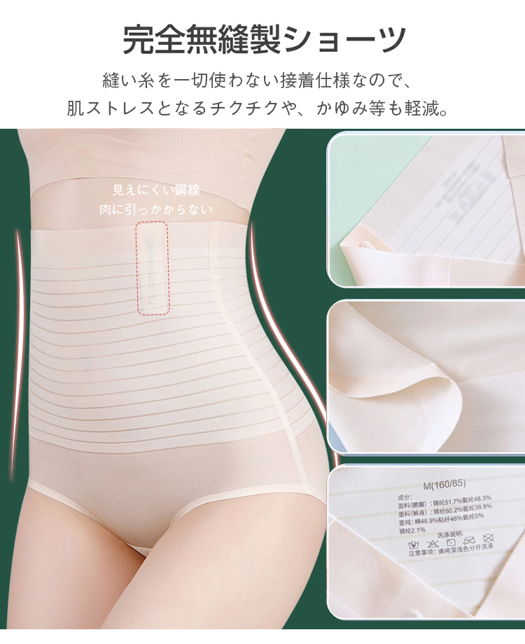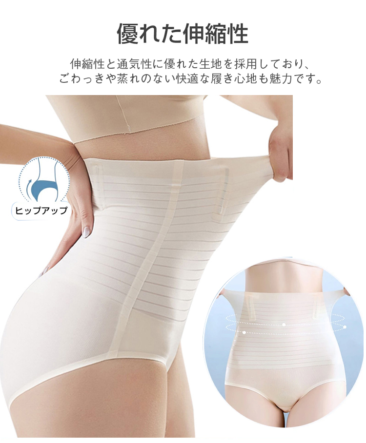 ハイウエスト設計:ウエストまわりからヒップまでスッキリと引き締め、理想的なボディラインを作ります。