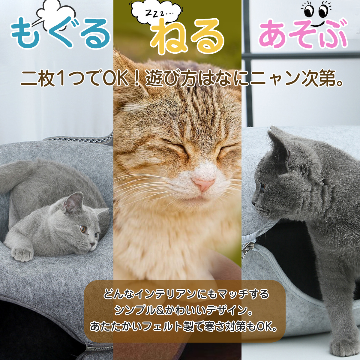 ドーナツ猫のトンネル:猫のトンネルはフェルト素材でできており、耐摩耗性、耐傷性、お手入れが簡単です。猫用ベッドと猫用トンネルは、寝たり遊んだりするペットの二重のニーズを満たすためのツーインワン設計です。猫のトンネルのユニークなデザインは、ペットのさまざまな睡眠のニーズを満たすことができ、ペットをより快適にします。