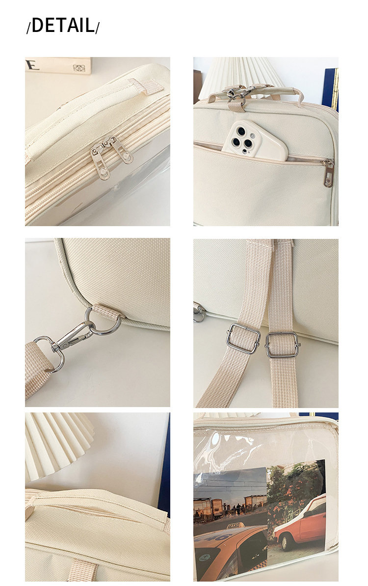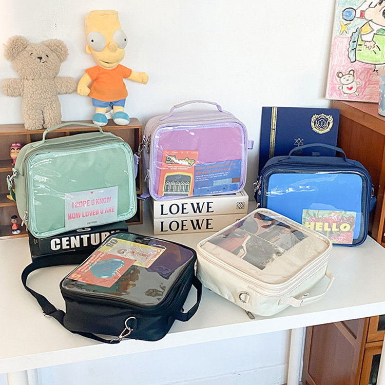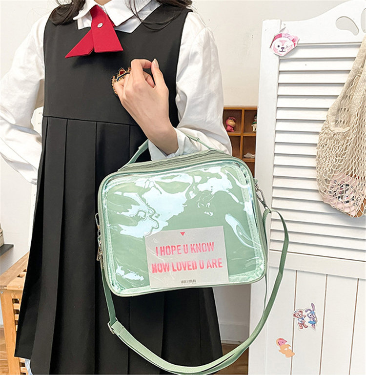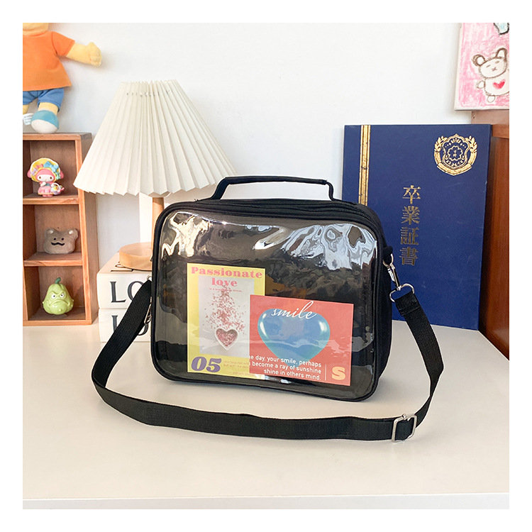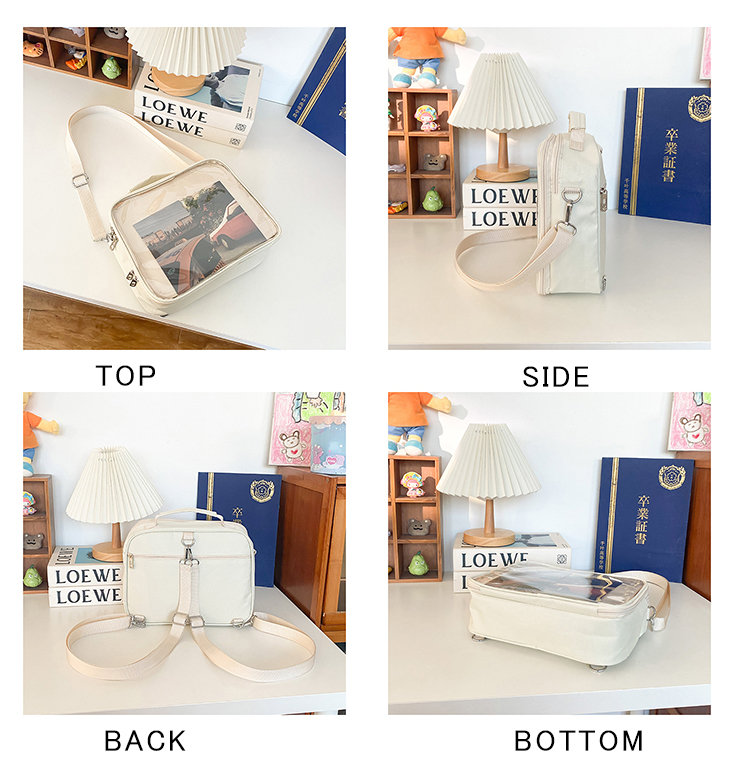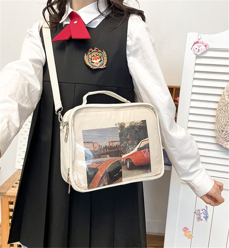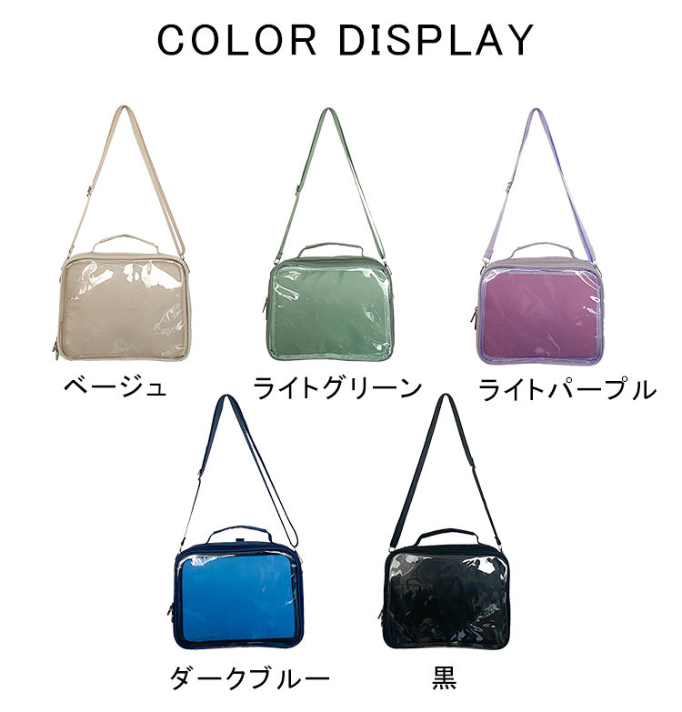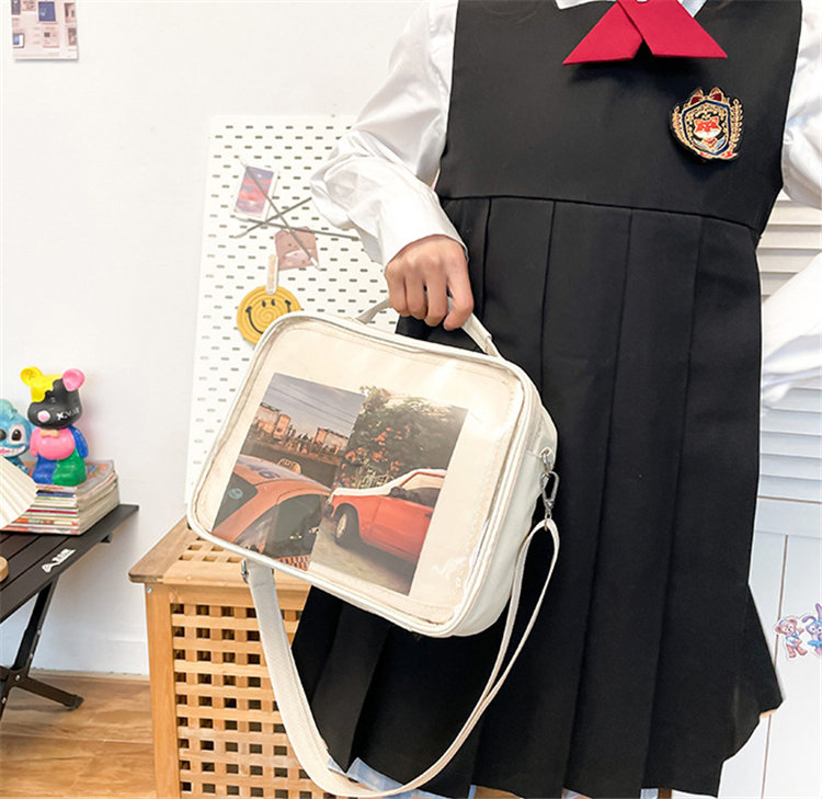 前の透明カバーに飾り板が入っていて、自分の好きな小物を入れることができるバッグです。 好きな芸能人や、アニメの写真 、缶バッジ、ストラップ、ぬいぐるみ、キーホルダーなどを入れるだけで、世界一つだけ自分のバッグです、毎日楽しく使える。