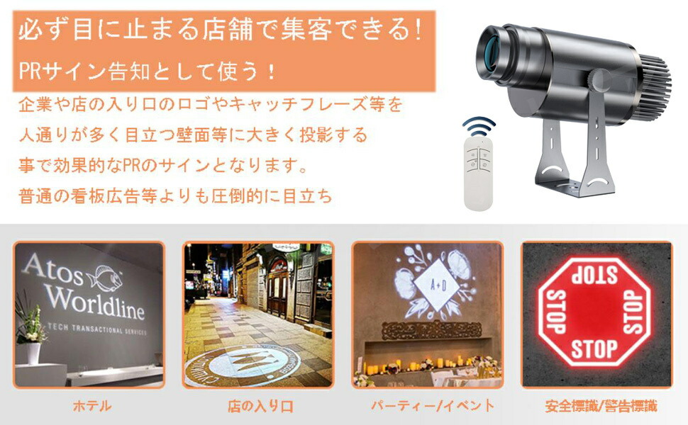 ロゴ投影 ロゴプロジェクター ロゴライト 照明 壁や地面に店舗ロゴ投影 什器 リモコン付き 看板 広告 集客 イメージUP 売上UP 光る 来客数UP
