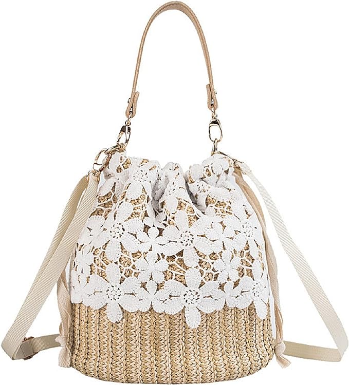 かご ショルダーバッグ 花柄 レース付き 斜めがけ 手提げ 巾着 ストロー かわいい 夏 サマー レディース