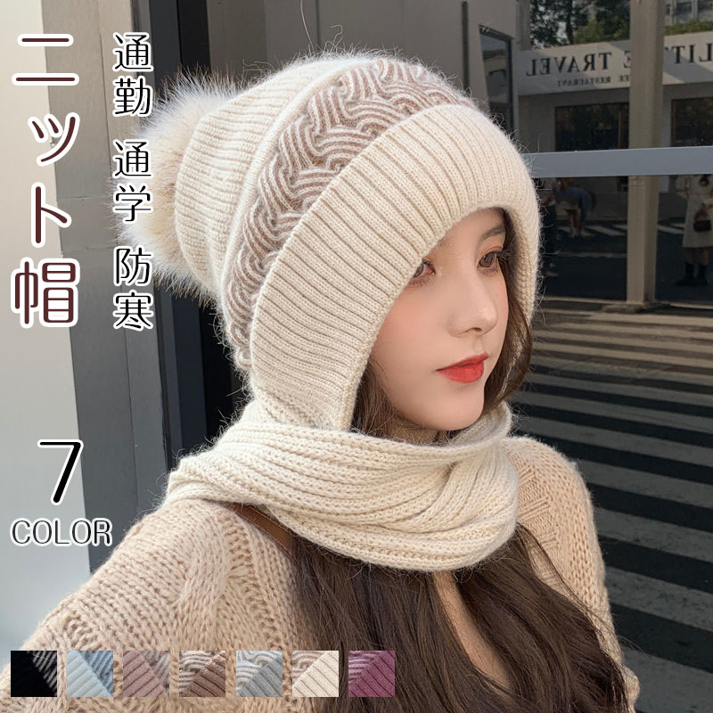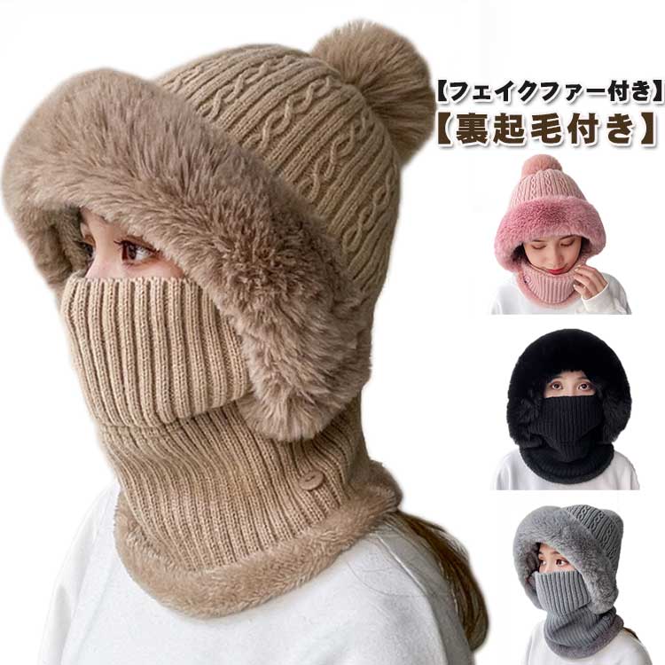 送料無料 ニット帽 ネックウォーマー 一体 ポンポン レディース ケーブル編み フェイスカバー付き フェイクファー 一体型帽子 ニット帽子 保温 目出し帽 おしゃれ かわいい