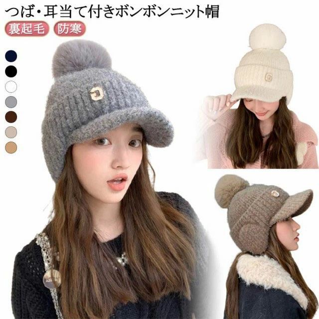 おしゃれ かわいい ボンボン ニット帽 つば付き 帽子 ゴルフキャップ 耳当て レディース ニットキャップ 韓国