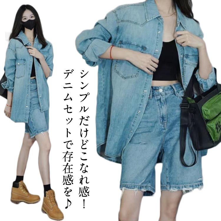 デニムセットアップデニムシャツ デニムパンツ レディース 上下セット デニム シャツ 長袖 ショートパンツ パンツ ジーンズ カジュアル 春秋 夏服 大人 可愛い きれいめ お出かけ 通学