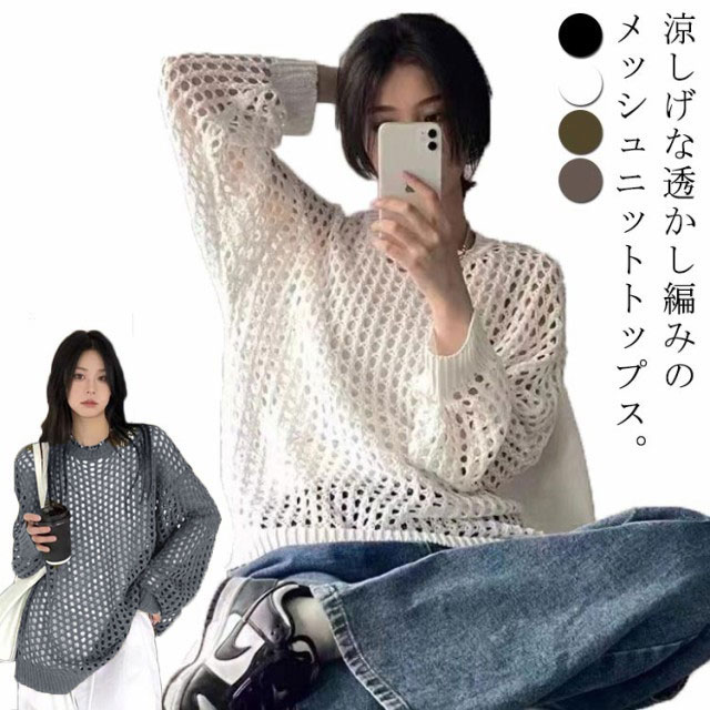 透かし編みニット 体型カバー クルーネック サマーニット ゆったり レディース プルオーバー 長袖 メッシュニット メッシュ編み セーター オーバーサイズ トップス レイヤード 重ね着 清涼感 涼しい