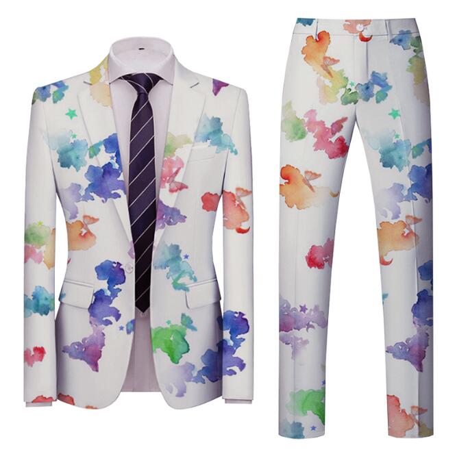 花柄 総柄 スーツ ステージ衣装 白に溌墨 彩色 カラフル プリント 山水画 メンズ スーツ 上下2点セット 一個釦 礼服 舞台 ステージ 演出 ダンス スーツセット