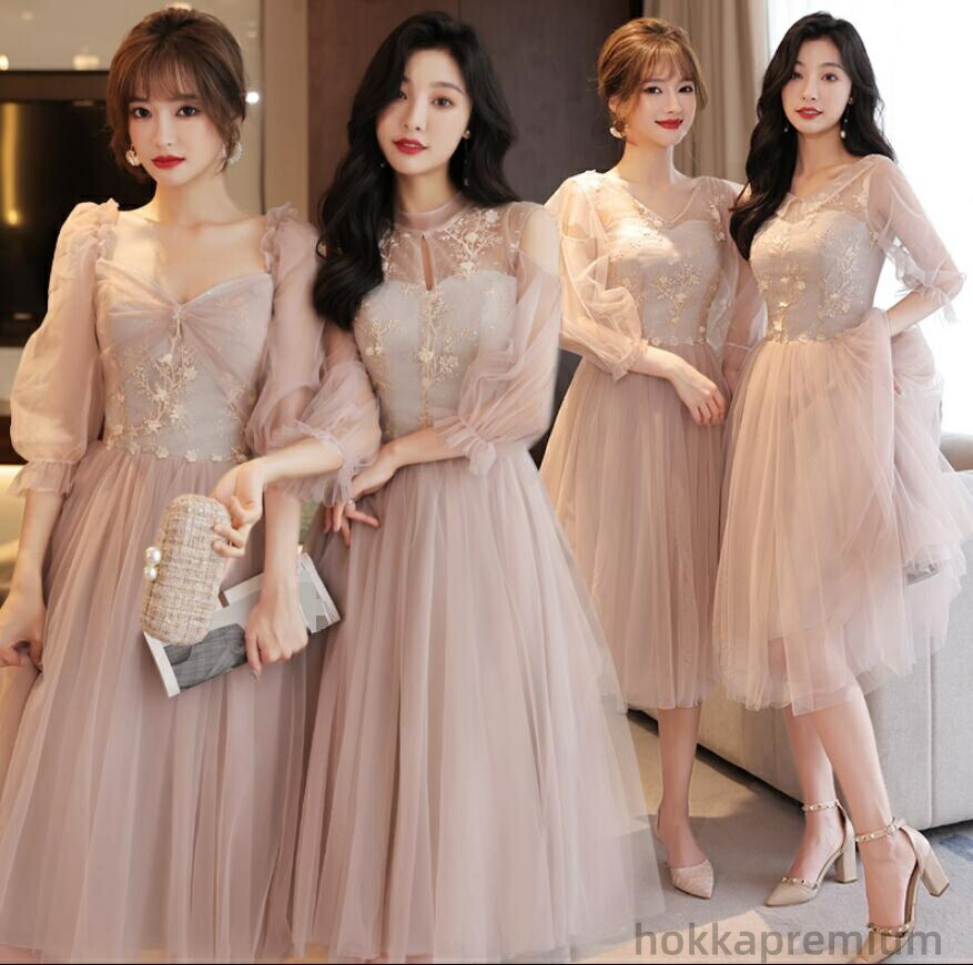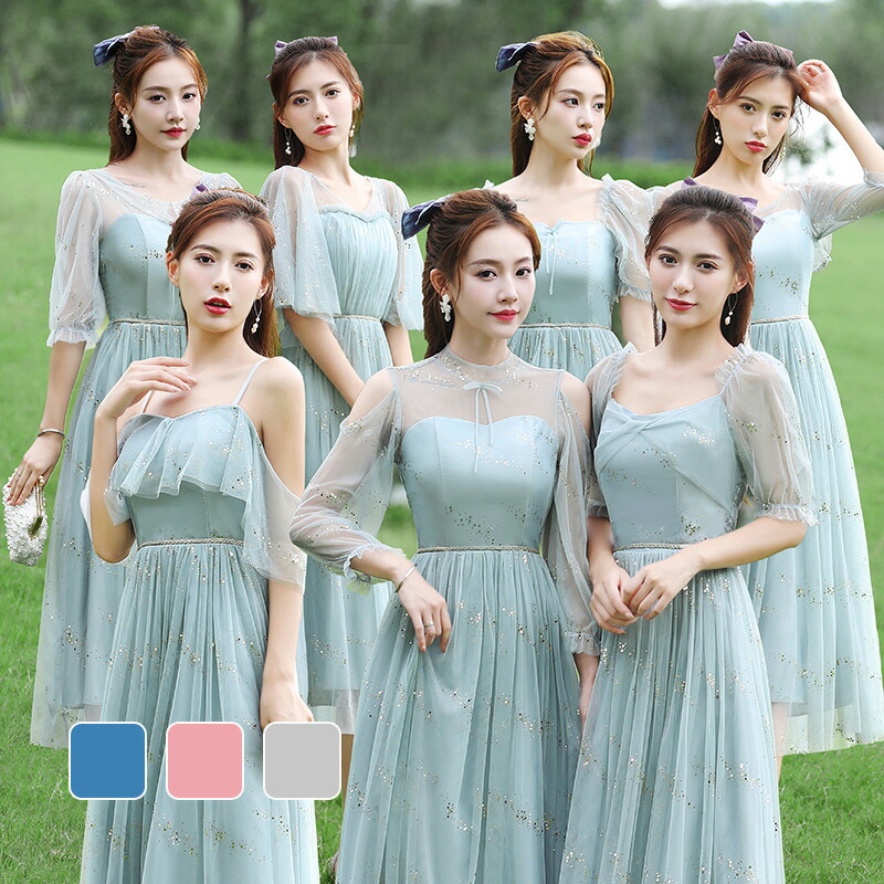 ブライズメイド ドレス ミディアム丈 ひざ下丈 膝下 フォーマルドレス パーティードレス Aライン フレア 結婚式 ワンピー 記念日 ダンス衣装 フリーサイズ くすんだブルー グレー シャン あずき色